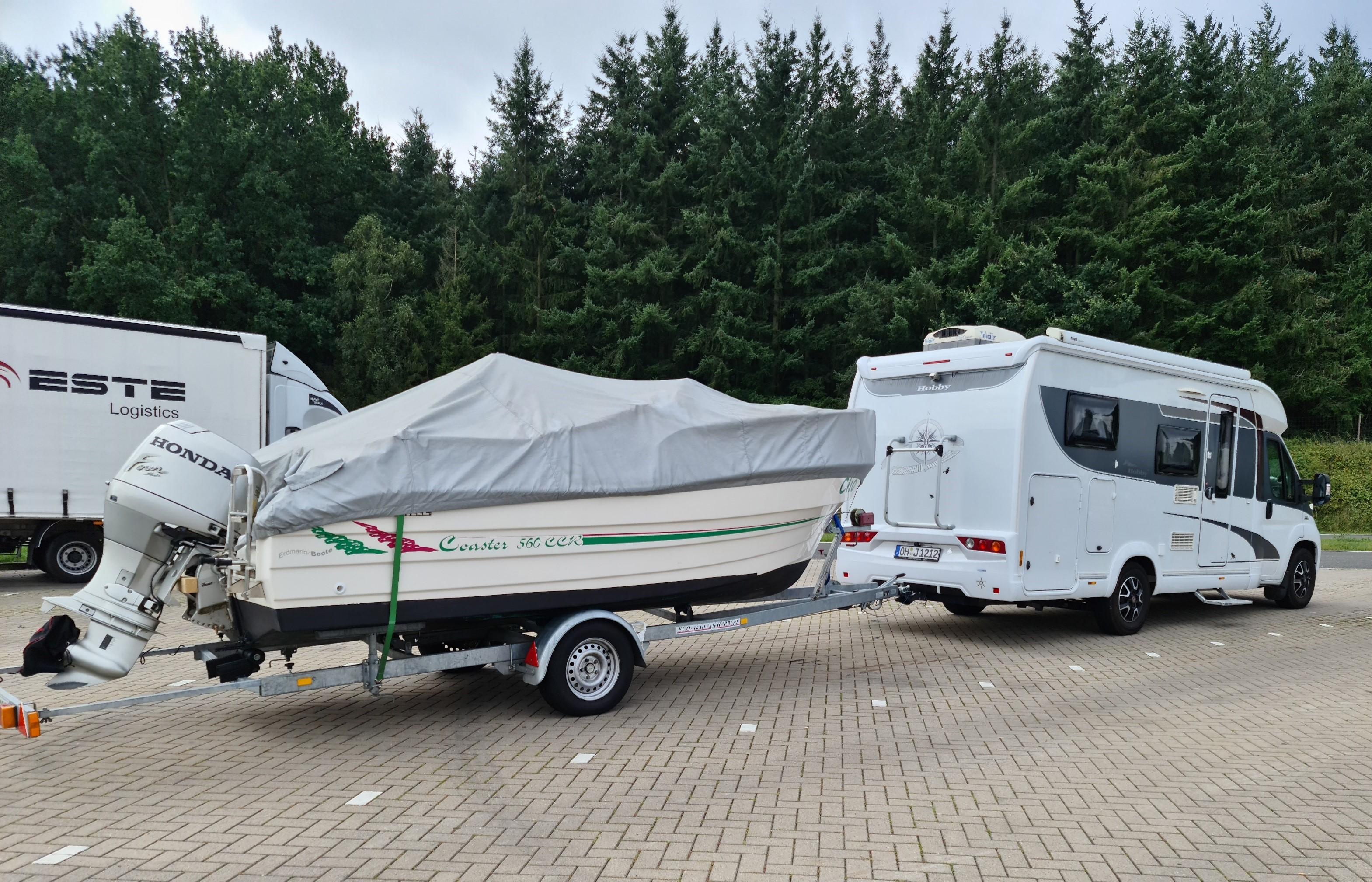 Unser Bootstrailer wiegt (mit Boot) 1,3 Tonnen und hat eine Stützlast von 75 kg.