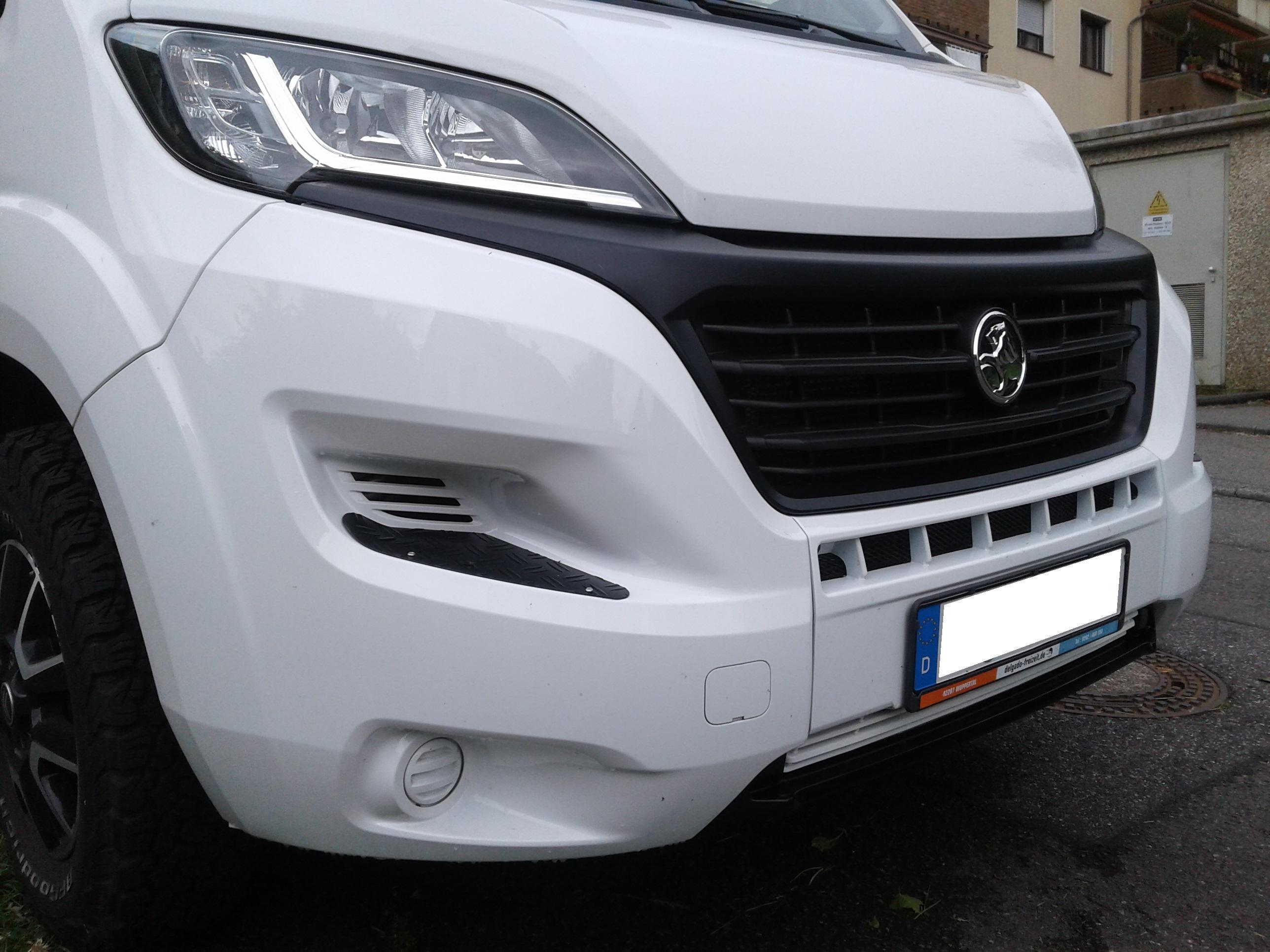 Für die ursprüngliche Verwendung des Ducatos als robustes Nutzfahzeug hat der Designer die Einstiege in der Stoßstange vorgesehen, um die höheren Bereiche der Windschutzscheibe zu "erklettern" (Scheibenreinigung). Bei den WoMos mit lackierten Stoßstangen wird's dann beim Aufstieg im nassem Wetter sehr rutschig - und der Lack sieht nach der ersten Gipfelerstürmung nicht mehr so richtig gut aus. Mit den Riffelblechen hat man eine rutschsichere Treppenstufe und kommt deutlich besser an den oberen Teil der Scheibe oder GFK-Haube.