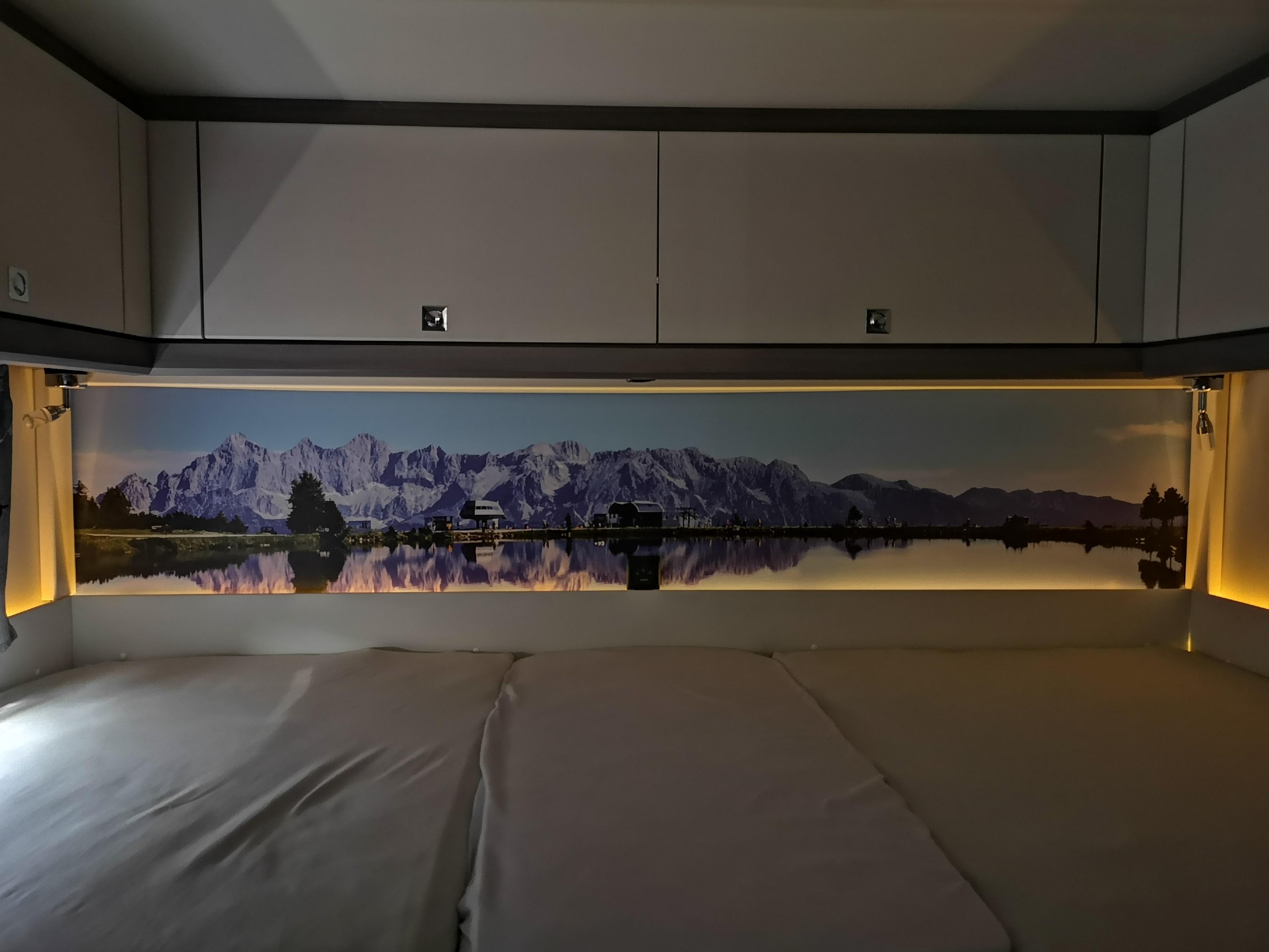 Mitlerweile ergänzt um einen Stripe über der Dinette und einen über der Spüle und natürlich ums Bett herum, um den Sonnenaufgang an der Dachstein-Gruppe würdig erscheinen zu lssen.