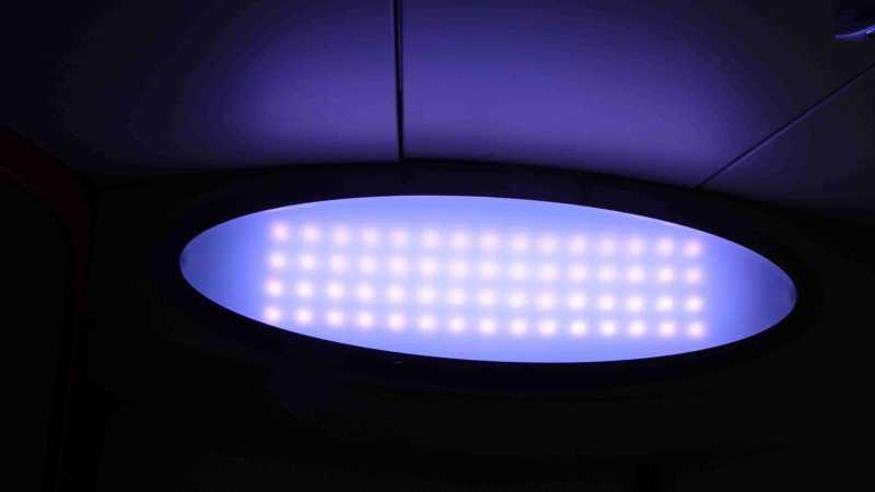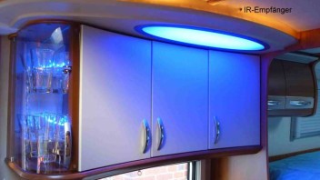 Die Kunststoffabdeckung des Strahlerhimmels lässt sich ganz einfach abschrauben. Die Leuchtstoffröhre mit Schaltgerät entfernen. Da ja schon 12V vorhanden ist, kann man das mitgelieferte Netzteil der LED-Strips einfach weglassen. Ich habe die Stripes eingeklebt, aber das hielt nicht, im Sommer wird es im WOMO einfach zu warm. Aber mit einem Tacker ließen sich die Stripes gut und dauerhaft befestigen. Den IR-Empfänger baute ich in den Kunststoffstreifen der indirekten Beleuchtung ein. Nun kann man die Beleuchtung sogar an das Blau der Bar anpassen. Siehe Foto1. Auf Foto2 ist die Anordnung der 4 Strips zu sehen.