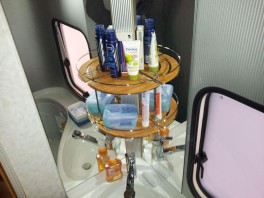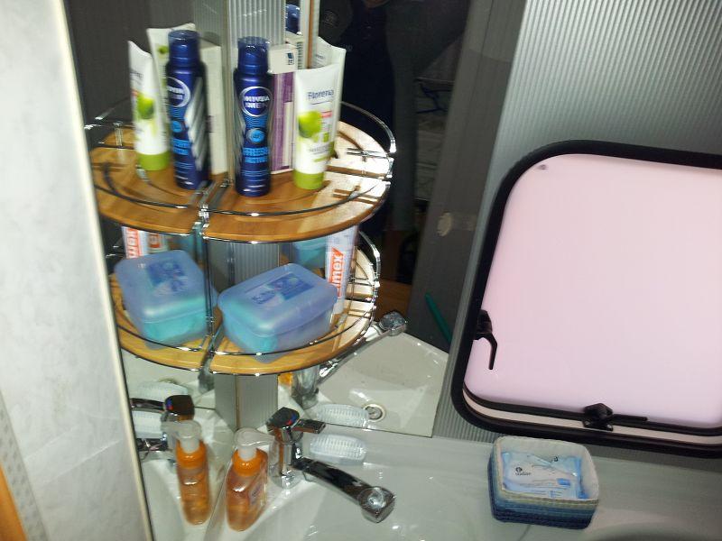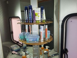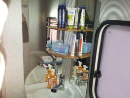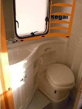 Bei diesen Abbildungen der Regale, welche die verschiedensten Kosmetikprodukte zeigen, die man eventuell auf dem Regal aufbewahren kann, handelt sich nur um Dekorationsgegenstände für den Werbefotograf, und stellt nicht den Zustand dar wie das WoMo sich kurz vor der Abreise, sprich im Fahrbereiten zustand sich befindet.
