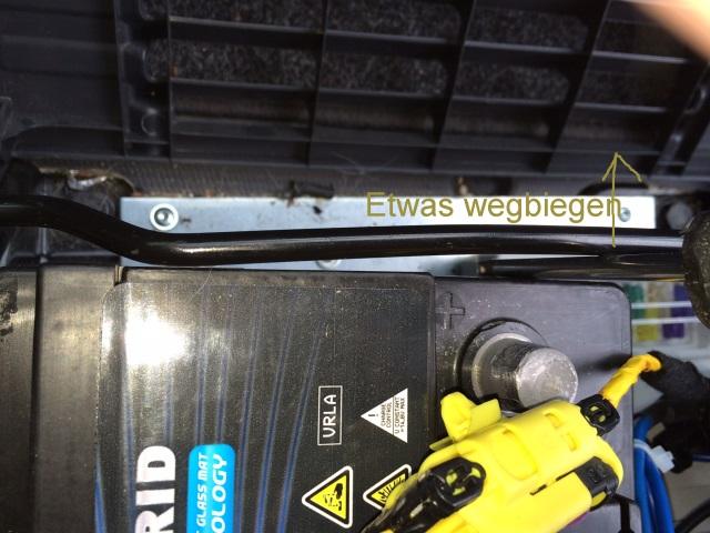 • Schritt 5: Stange am Vorderteil der Batterie etwas nach vorne drücken (mit Schraubenziehener o.ä.) da Batterie sonst nicht nach oben entnehmbar ist