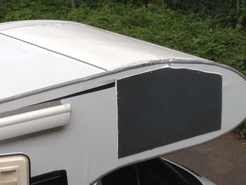 Die Beule im Dach hat man unterfüttert und eine große weiße Platte draufgeklebt/geschraubt. Das hält alles und ist erstmal dicht. Das Fenster rausgenommen, von innen eine weiße Kunststoffplatte gegengeschraubt und von außen halt die dunkle Platte. Warum die nicht weiß ist, weiß ich jetzt nicht. Vielleicht machen wir einen weißen Schriftzug drauf "Ela - Pfingsten 2014" … :laugh: