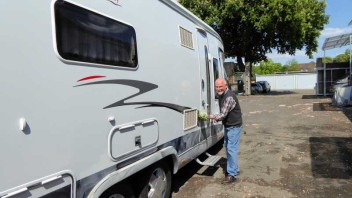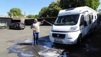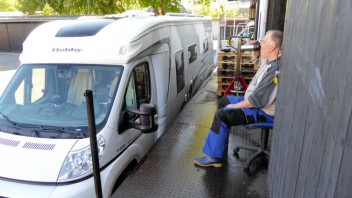 Dort kann man sehr gut ein Wohnmobil waschen. Erst die eine Dachseite von der Bühne aus,