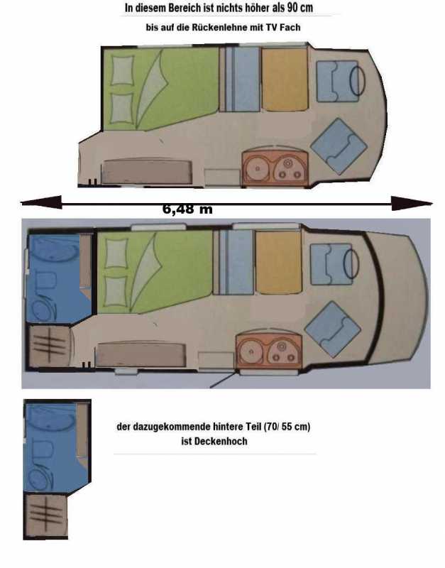 Wie bei vielen, liegt auch bei uns die Schmerzgrenze bei 6,5 m, länger sollte es nicht sein. Wie also ein Raumkonzept eines 8m WoMo in etwa bei einem 6,5 m WoMo umsetzen? Inspiriert vom Hobby Toscana Exclusive 750 ELC ([b]Heddagerd/ Gerd[/b]) habe ich mal den Hobby 550 am PC 0,7 m verlängert auf 6,48 m (die Länge des Hobby T 600FC) und die Hintere, wie seitliche Raumfläche nach unseren Vorstellungen angepasst.
