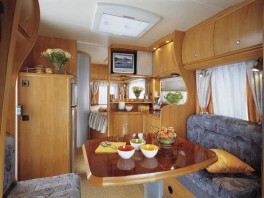 Die Farbe der Einrichtung ist warm,wohnlich aber doch nicht dunkel. Das Raumgefühl ist super und an der abgewinkelten Küche läßt sich super arbeiten auch wenn andere Personen an einem vorbei wollen, der Kühlschrank mit dem Gefrierschrank ist super zu erreichen und in den Gefrierschrank passt locker ein Partyfass. Das TV Fach ist perfekt, nachdem ich mir eine dreh Halterung gebaut habe an der der TV etwas nach unten abgewinkelt ist, läßt sich super aus dem Bett aber genauso bequem von der Sitzecke schauen. Durch die Schiebetür kann man den gesamten Schlafbereich verschwinden lassen. Die Sitzecke ist durch die Anordnung der Bänke sau gemütlich (Drehsitze und dann Füße hoch). Im Bad ist jetzt richtig Platz. Für die Fahrzeuglänge ist der Platz top ausgeschöpft. Durch den nicht vorhandenen Alkoven sind die Fahrgeräusche viel angenehmer und das Fahrverhalten auch. Wir würden zur Zeit gegen keinen anderen tauschen wollen, und das ist für mich ein sehr gutes Zeichen.