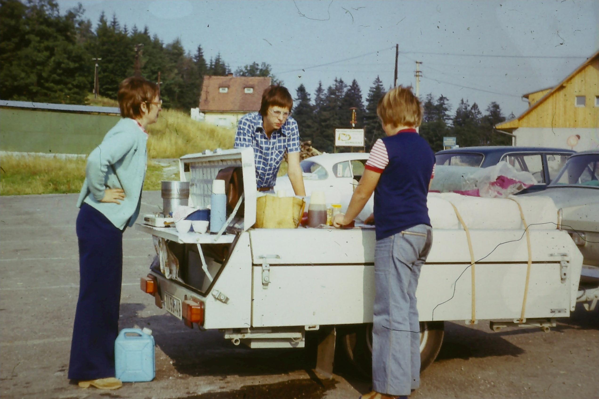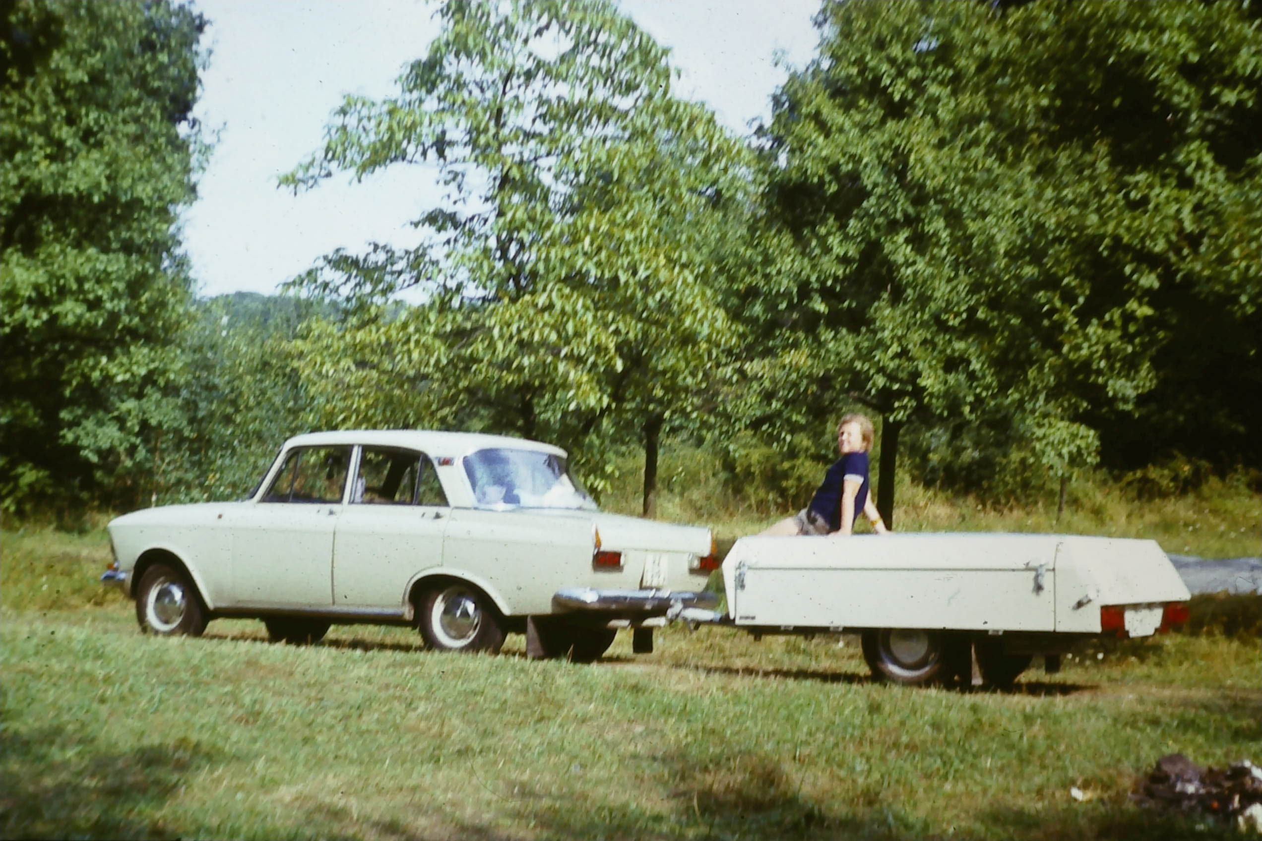 Ja die alten Zeiten, das war ich vor 40 Jahren. Zugfahrzeug ein Moscvich 412 und im Anhang ein CT 5. Der Luxus ... Kochen auf dem Parkplatz ....