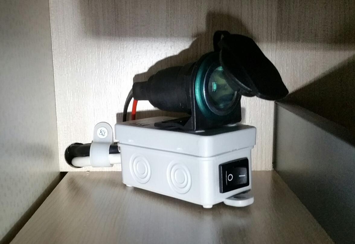 Nachdem wir momentan noch nicht die Anschaffung einer vollautomatischen SAT-Anlage planen, liegen die Kabel ungenutzt in der oberen Ablage. Daraus lässt sich am Bett eine sinnvolle Lademöglichkeit z.B. für das Handy improvisieren.
