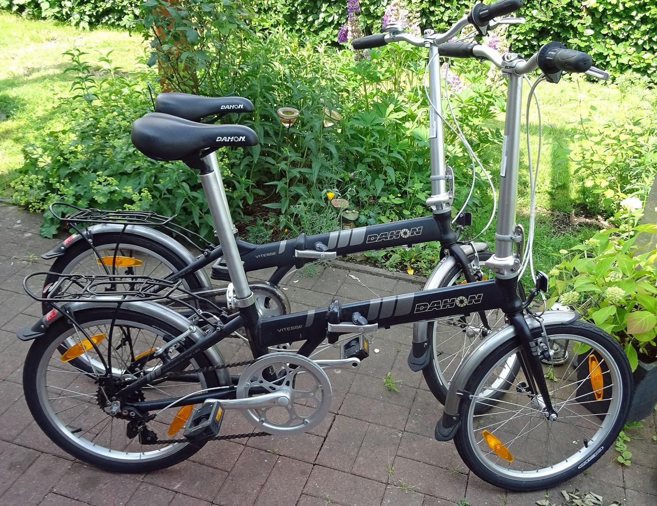 wir haben zwei Dahon-Klappfahrräder abzugeben. Die dienten uns einige Jahr (vor etwa sieben Jahren von uns neu gekauft) als "Beiboote" in den Wohnmobilen, haben eine geringe Laufleistung und normale Abnutzungsspuren (eines hat einen kleinen Riss am Sattel, den ich überklebt habe). Eins von Beiden (das "Mädchenrad") hat eine Drei-Gang-Nabenschaltung, das andere (das "Jungsrad") hat eine Sieben-Gang-Kettenschaltung. Beide waren vor drei Wochen zur Inspektion in einer Fachwerkstatt in Rendsburg und sind daher tadellos in Schuss. Der Neupreis der Räder (ich hab leider die Rechnung versuselt) lag irgendwo bei rund 350,- bis 400,- Euro pro Rad. Zwei passende Taschen von AWM würden wir ebenfalls mit abgeben.