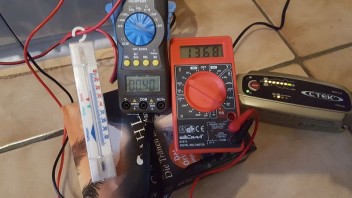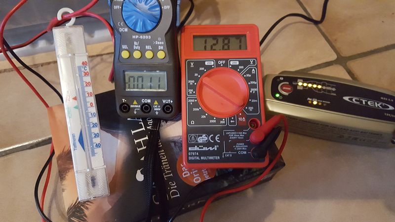 Damit hast du völlig recht, denn bei der erste Messung mit dem MXS 5, gerade aus dem warmen Auto, gut verpackt herausgenommen, bekam ich zwei verschiedene Werte, mein Gerät zeigte 14,78V an und das meines Freundes 14,62V, es war ja noch warm. Nach einigen Minuten bei ca. 6° liegend, waren beide Wert sofort exakt gleich.