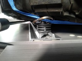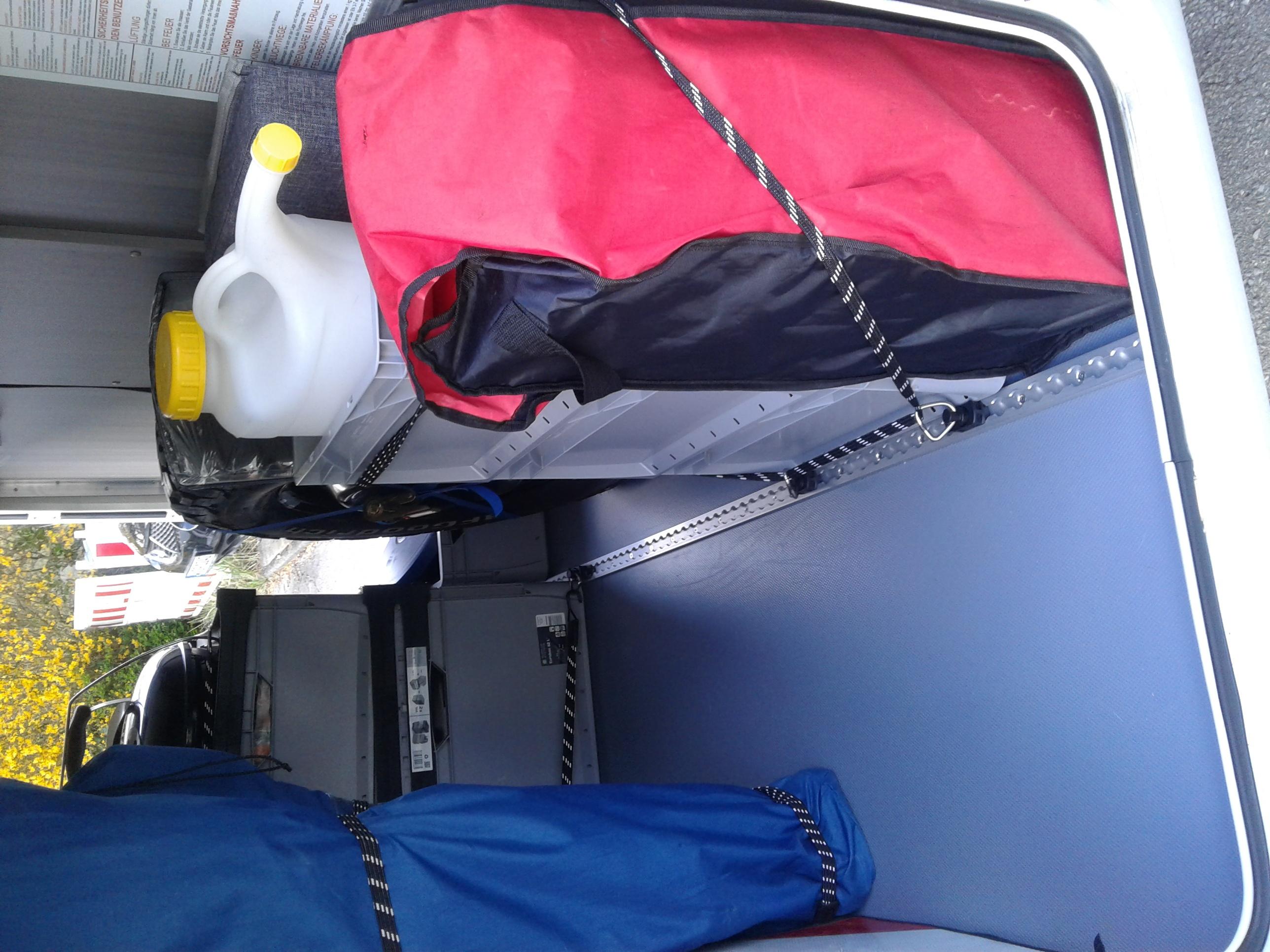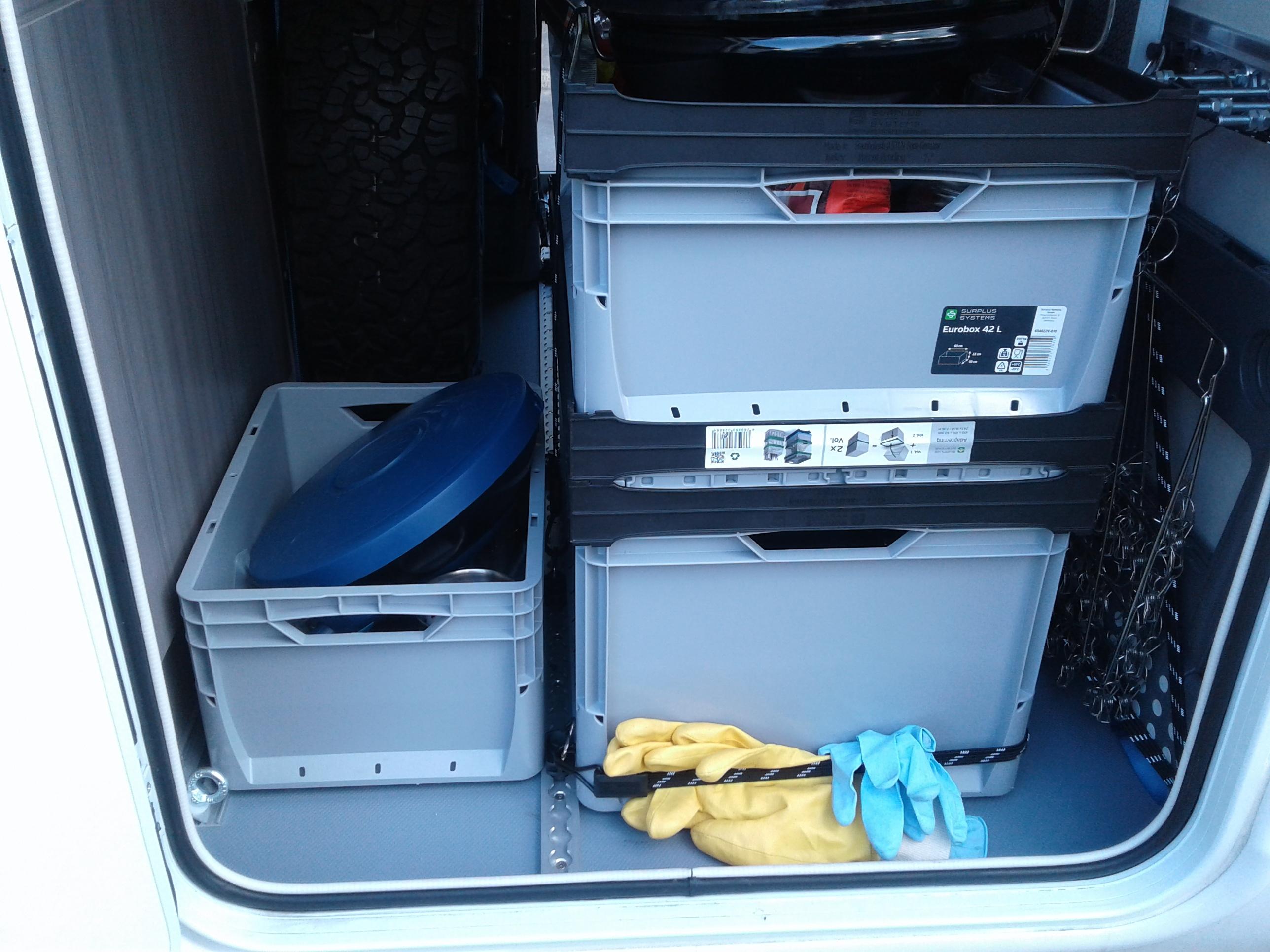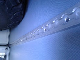 Zur optimalen Sicherung meiner Euro-Boxen habe ich auf den Boden ein Profil mit 4,5 x 20 mm Senkkopf Torx in VA2 verschraubt. Alle 10 cm eine Schraube. Kleben funktioniert auf dem genoppten Kunststoffboden nicht, da der Bodenbelag selber nicht besonders gut auf der Bodenplatte verklebt ist.