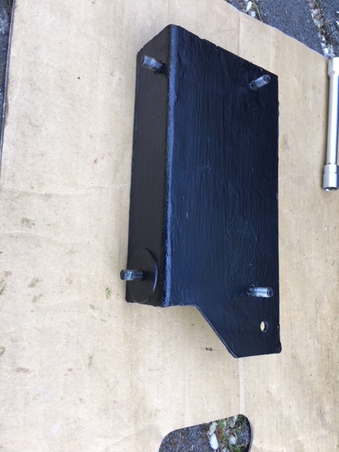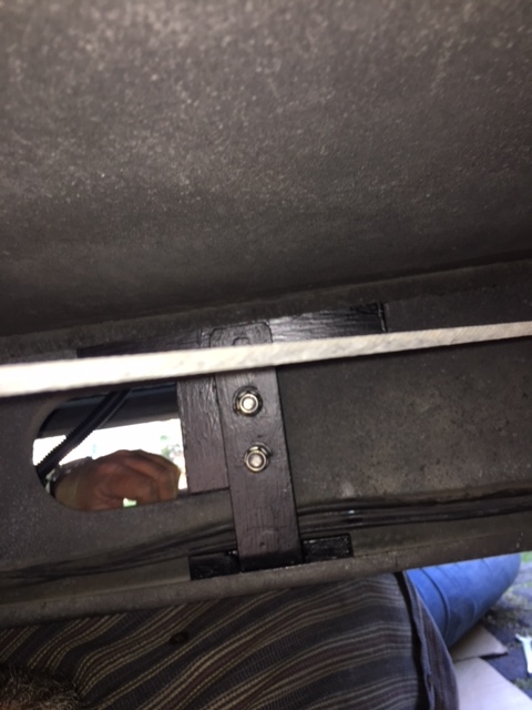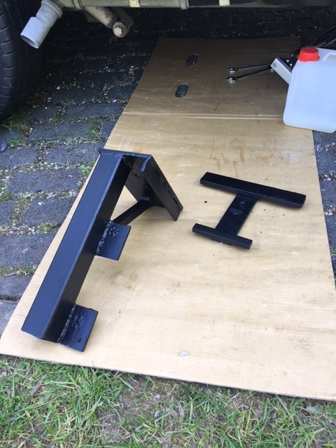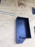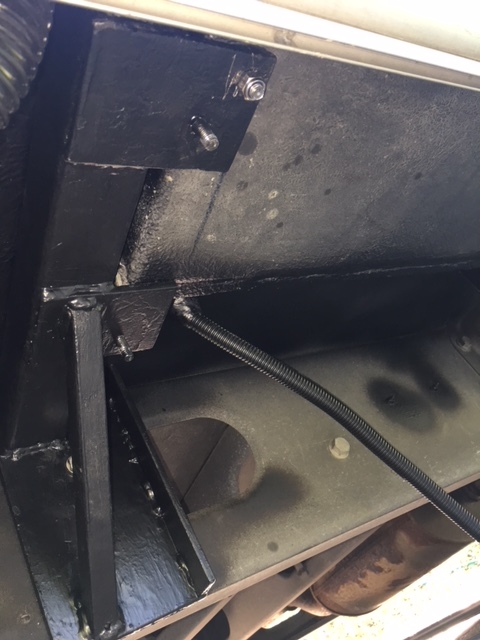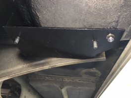 Ich überlege allerdings noch, wie ich die Stufe am besten unterschraube. Rechts neben dem Tritt ist ein Querholm vom Rahmen mit abgewinkeltem unteren Abschluss, also geradezu ideal; aber links ist nichts dergleichen. Dort komme ich auch nur durch ein kleines seitliches Loch innen in dem grauen Kunststofftreppeneinsatz, wodurch man den Abwasserabsperrhahn betätigen kann, in den Zwischenboden links neben der Treppe. Eigentlich wollte ich Schlossschrauben vom Zwischenboden aus einstecken und durch die untere Bodenplatte die Stufe verschrauben.
