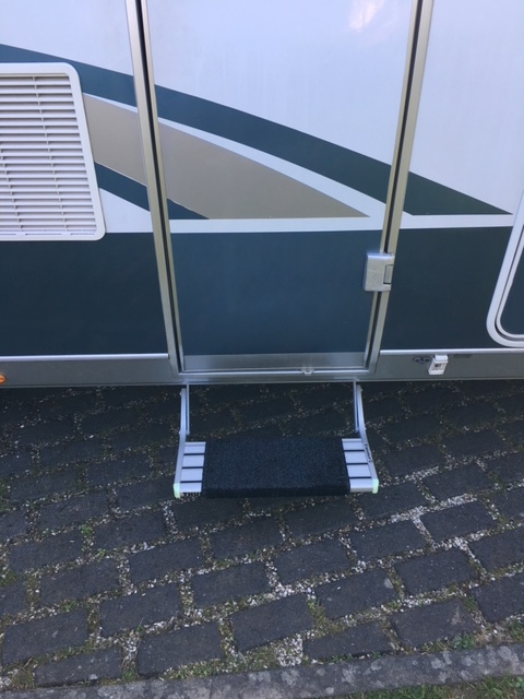 Ich möchte an meinem Womo eine elektrische Trittstufe nachrüsten. Habe mir die Thule Single Step 550 gekauft. Verliere dadurch zwar viel Bodenfreiheit weil sie eingefahren auch noch 18 cm Höhe hat ist aber dann ausgefahrenen genau auf halber Höhe zwischen Boden und erstem Tritt im Womo, was ich für ideal halte (anders als bei den geraden Slide out Stufen, die auch einige bei ihrem Hobby verbaut haben). Die Elektrische Installation erscheint mir unkompliziert.