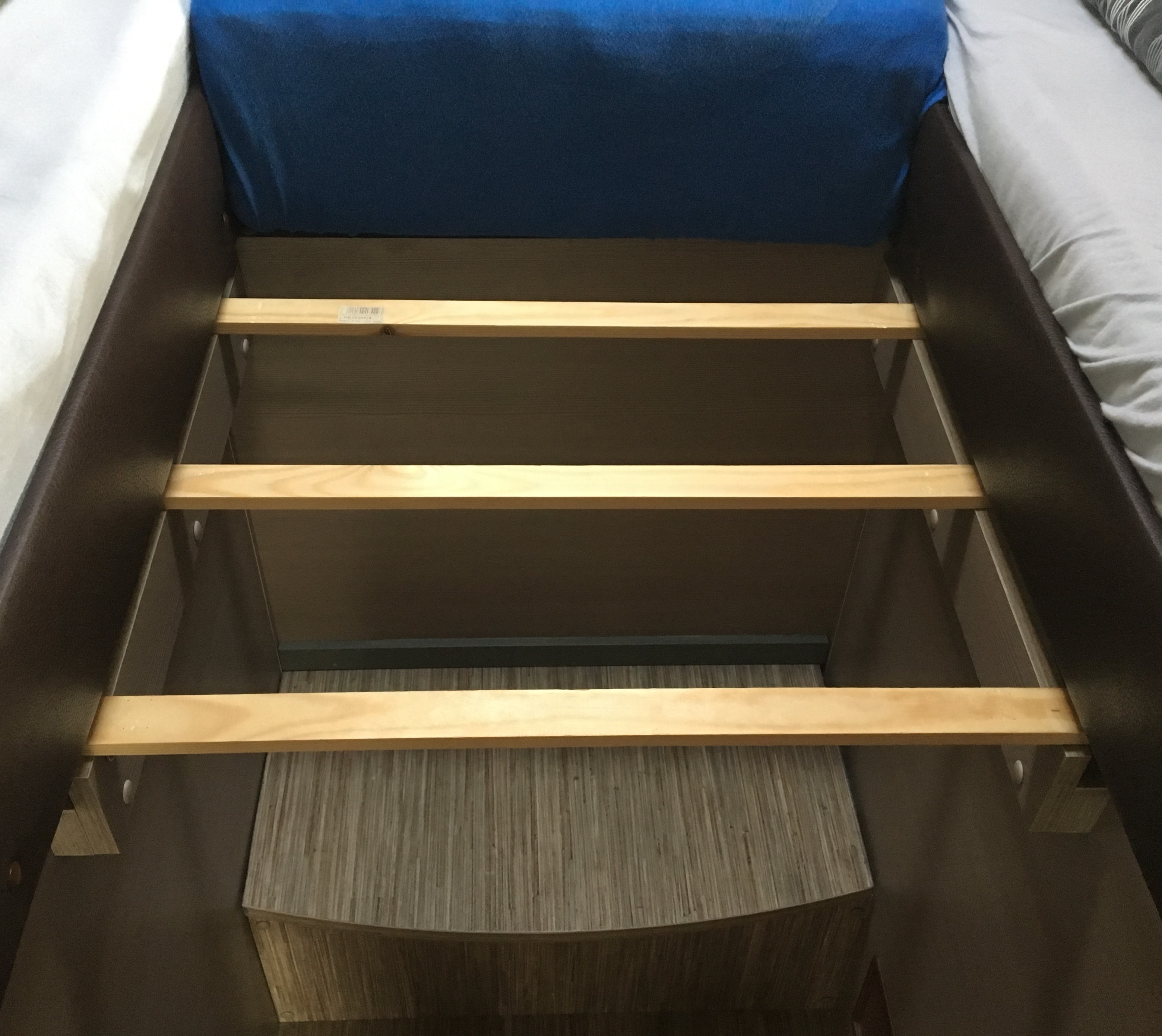Wir haben einfach alles verbaut und somit eine grosse Liegewiese. Das Bettzeug fällt nicht herunter und man hat genügend Platz zum Ausbreiten. Die Leiter lassen wir während unserer Fahrten auch immer davor. Stört doch nicht weiter. Man kommt überall heran.