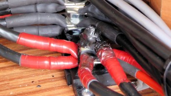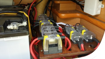 Provisorisch jetzt erst einmal eine 30A Flachsicherung direkt zwischen die beiden Kabelschuhe der Leitungen gesetzt. Auch die wird logischerweise sehr warm (ca 80 Grad), aber das sollte jetzt erstmal gehen. Am WE kommt da ein Halter für Streifensicherungen rein.