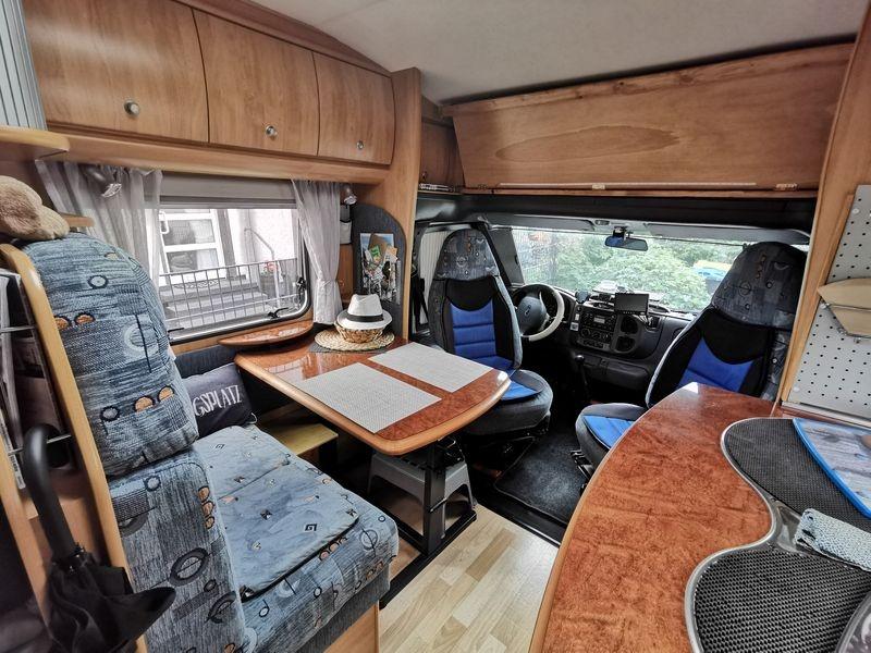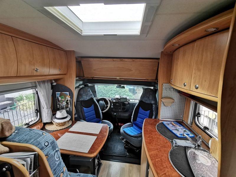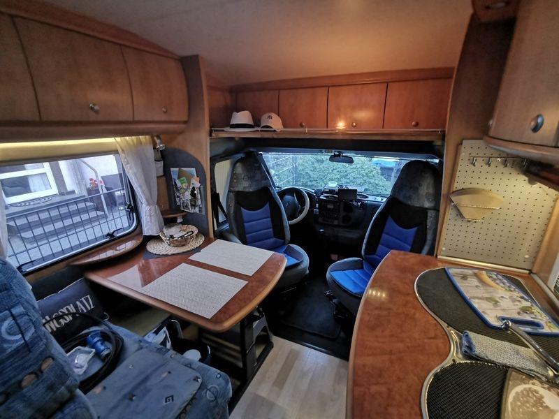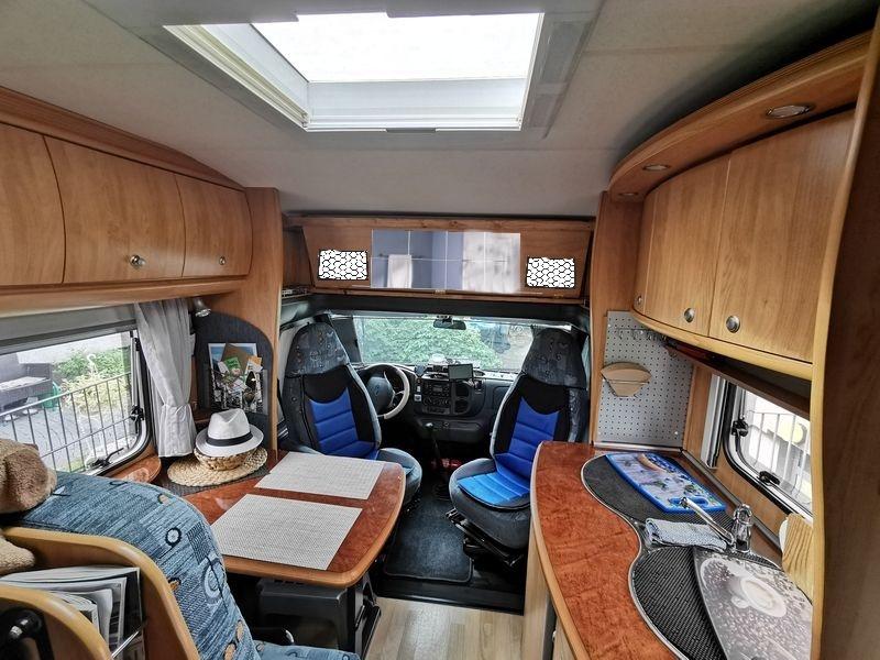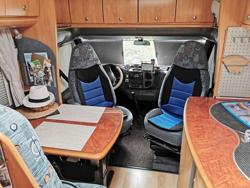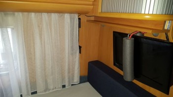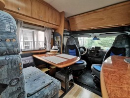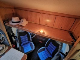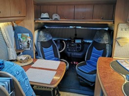 Über den Vordersitzen, zwischen den Hängeschränken, ist jetzt eine Ablageplatte aus Sperrholz, mit einer Stärke von 8 mm in Erle Farbton (Lasur). Das Ganze ist hochklappbar und alle Hängeschränke lassen sich problemlos öffnen und füllen, auch die kleinen Seitenablagen sind unverändert zu gebrauchen. Während der Fahrt kann die Ablage in beiden Positionen arretiert werden.