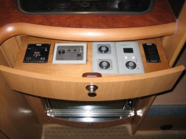 Weitere umbauten wurden gleichzeitig ausgeführt, da ich einiges an Technik verbaut habe suchte ich nach einer geeigneten Lösung um nicht alles sichtbar zu verbauen, und trotzdem leicht zugängig zu sein. Wie schon unter dem Gasbackofen befand sich auch oberhalb ein fixes Ladenvorderstück welches ich in eine sogenannte Techniklade umfunktionierte und die Anzeigen für Batteriecomputer – UV Wasserdesinfektion – Gasfernschalter – Truma Duomatic L Plus – Truma Sonatic Duo und dazugehörige Sicherungen eingebaut habe.