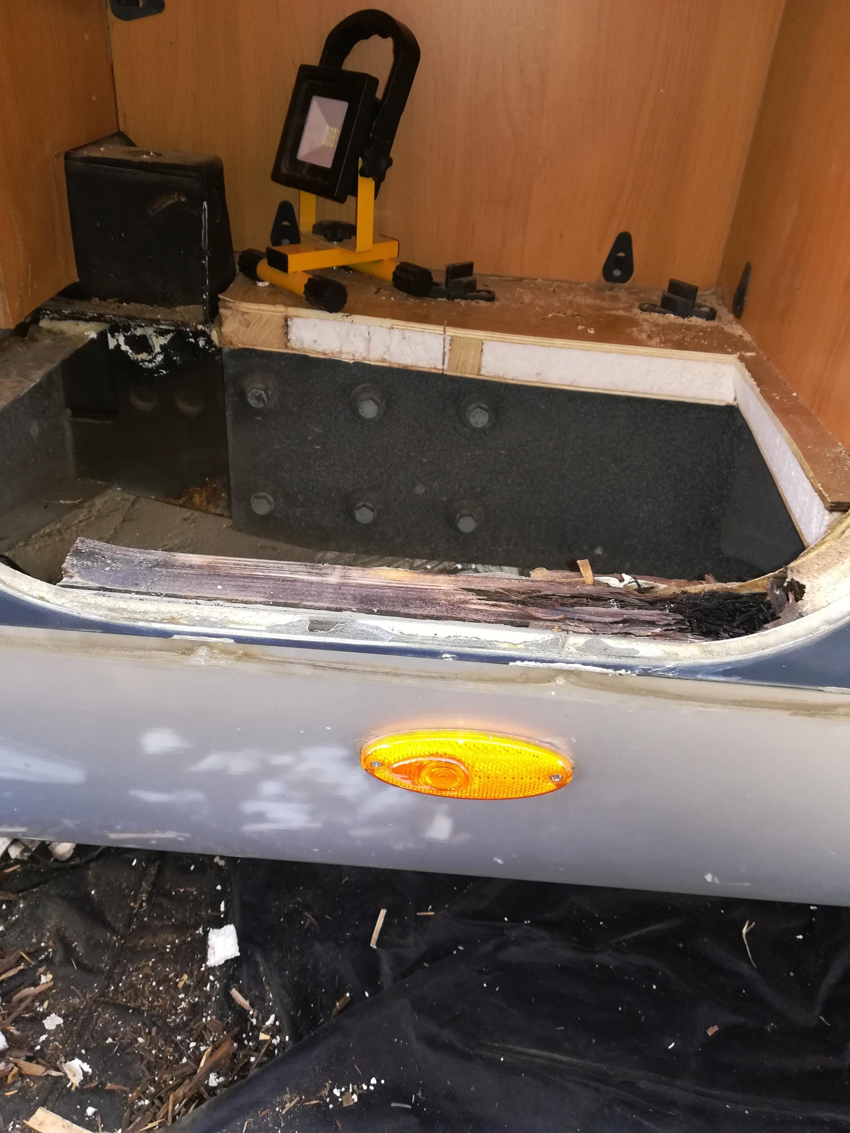 Zum Glück war dort ein Plastikteil und das Holz mit sehr viel Kleber drauf verklebt. Sonst hätte ich vor dem hinteren Radlauf auch noch den Boden kaputt. So war das Wasser in der Wand bzw im Styropor.