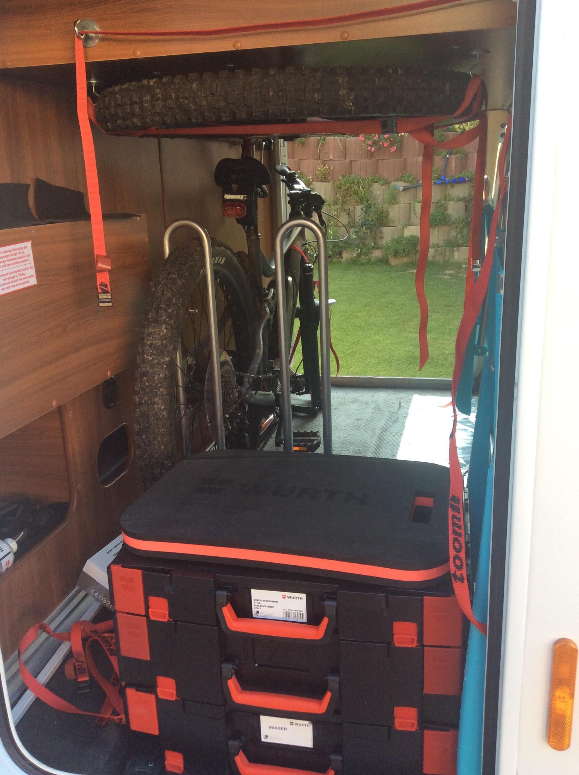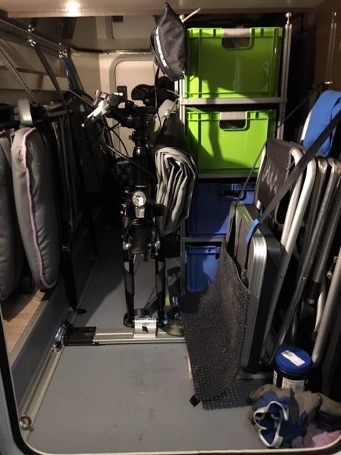 wir haben zwei Klappfahrräder von RSM-Bike in der Heckgarage somit passen von der anderen Seite noch Stapelkisten 60x40 rein und wir klappen nur den Lenker ab. Das System von Bernd ist auch super