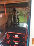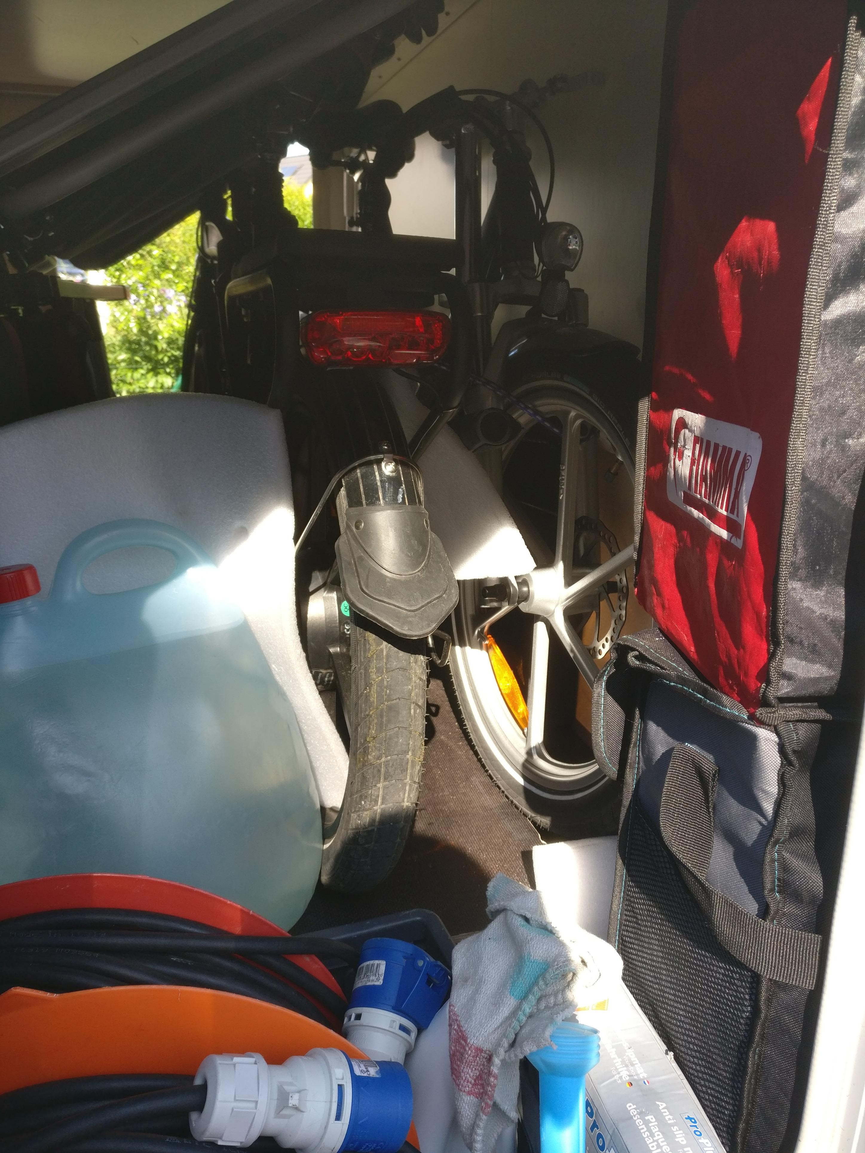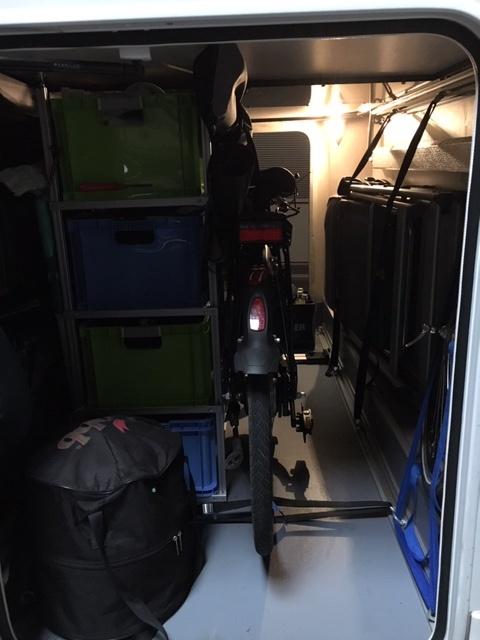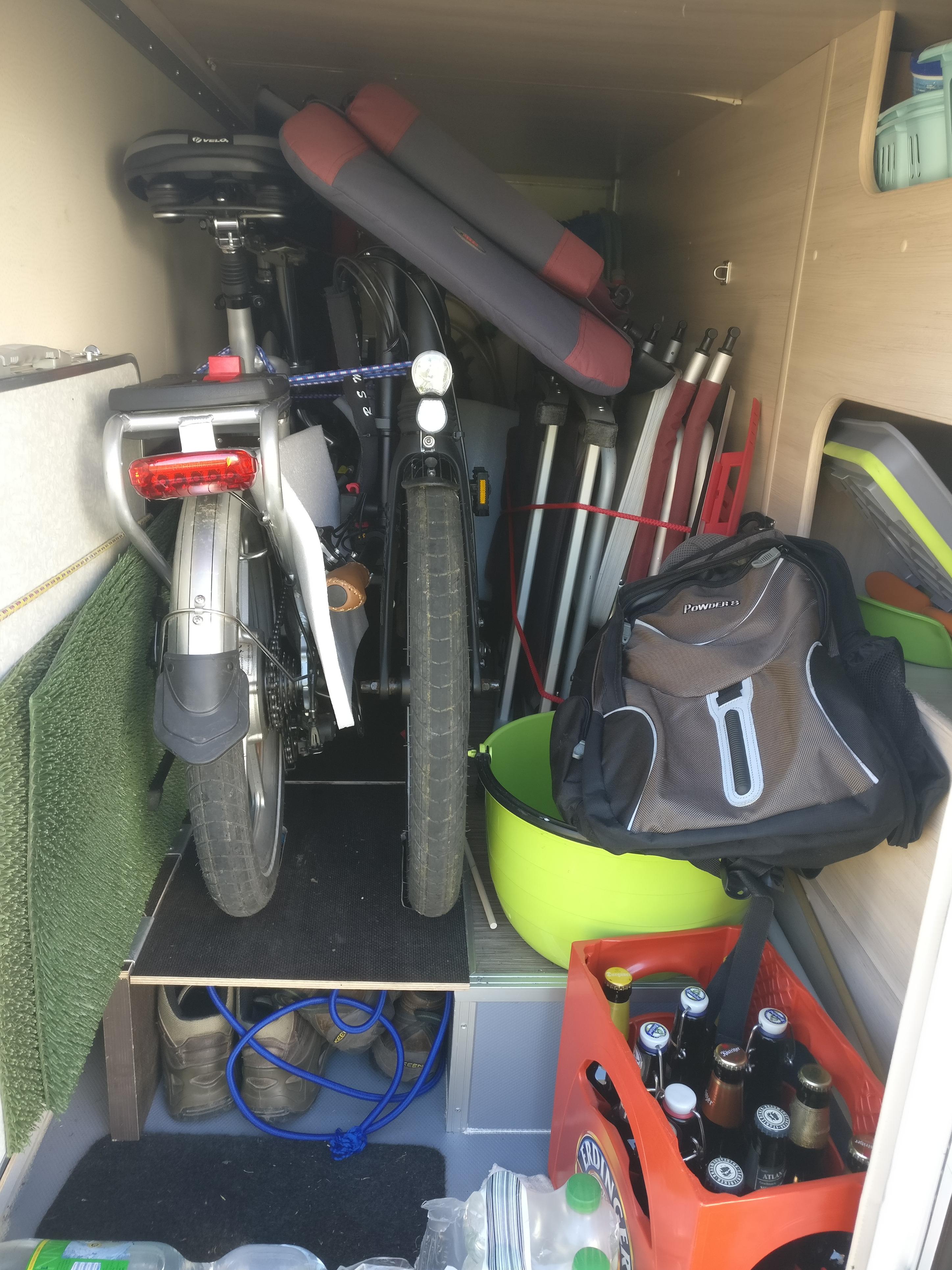 auch wir haben zwei Klappfahrräder von RSM-Bike in unserer kleinen Heckgarage. Habe diese ein wenig modifiziert, damit im Sommer das Faltboot mit kann und in der kalten Jahreszeit ein wenig Gedöns drunter passt. Sieht ein wenig rümpelig aus, ist aber inzwischen recht effizient für uns.