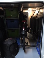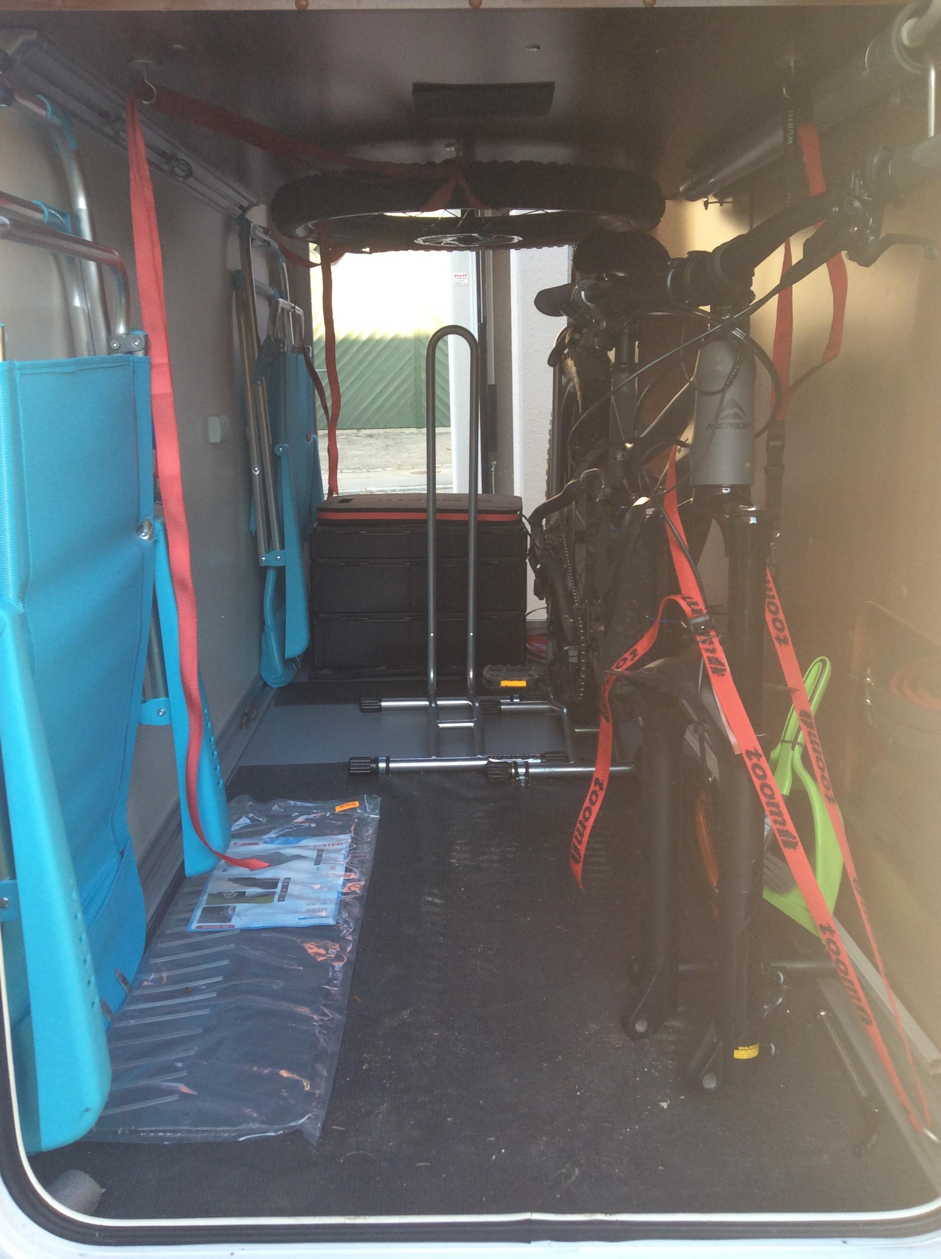 Wir haben 2 E-Bikes von KTM dabei, wobei die Rahmengröße 56 und 62 cm ist. Die Fahrräder werden gegenläufig (jeweils von einer Seite) in die Heckgarage geschoben. Vorher entferne ich jeweils das Vorderrad und montiere die Räder mit der Vordergabel an jeweils einen Schnellspanner, wie sie beim Radrennen bei den Begleitfahrzeugen auf dem Dach benutzt werden. Die Schnellspanner sind auf einem Brett montiert das in der Garage an der Bodenschiene befestigt ist. Die Lenker werden um 90 Grad verdreht und bei dem größeren Rad wird noch der Sattel tiefer gesetzt. Die Vorderräder stelle ich jeweils zwischen die Fahrräder im Bereich des Diamantrahmen.