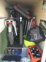 Ausserdem haben wir ein Regelsystem, Stühle, Tische und viel Zubehör in der Heckgarage. Alles passt hinein. Ich habe lange kalkuliert und gemessen bis es passte;-) Im Forum habe ich auch wertvolle Tips und die kompletten Maße der Heckgarage erhalten, weil unser Womo noch nicht ausgeliefert war.