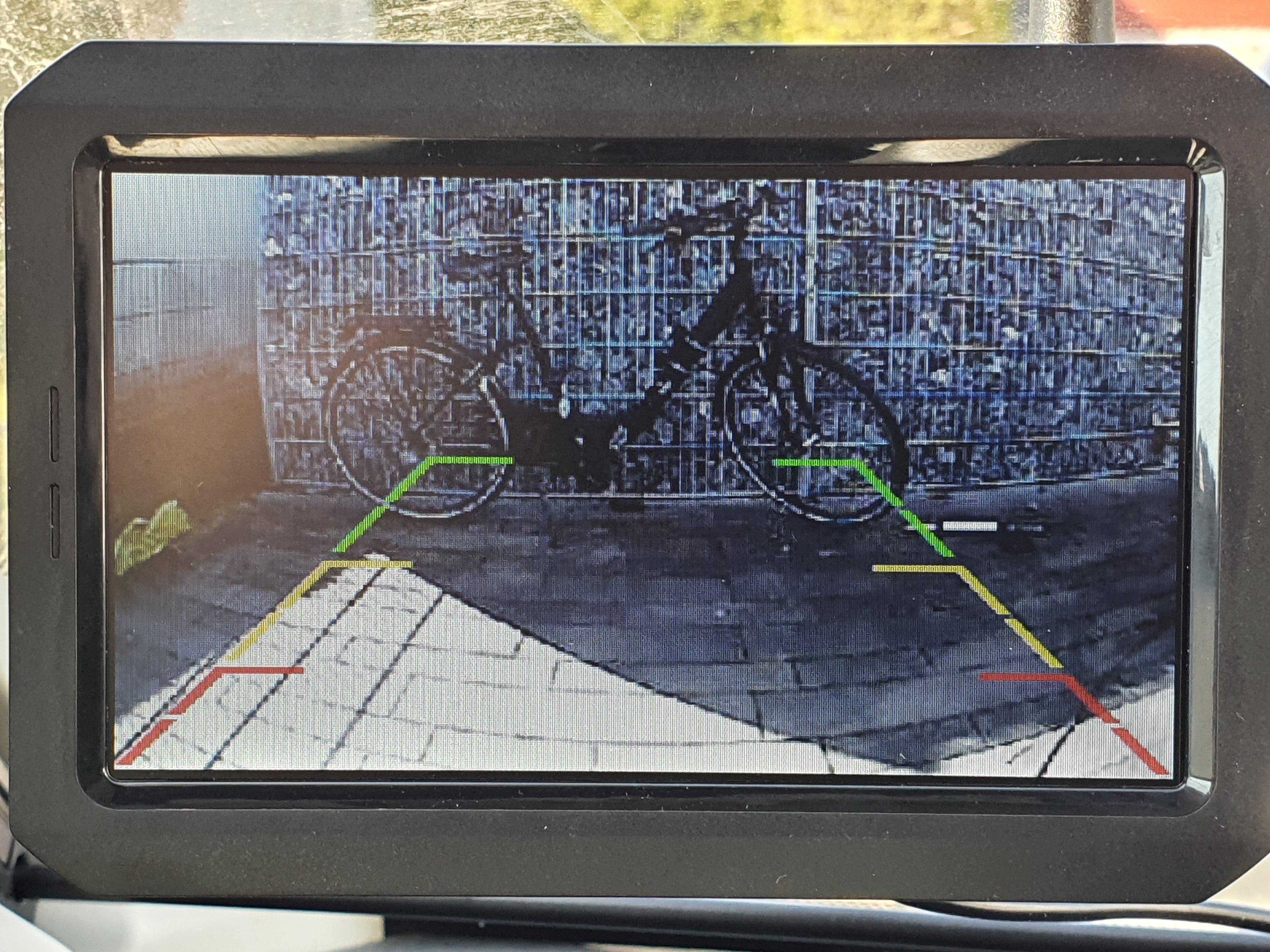 Die Kamera funktioniert auch sehr gut. Allerdings ist darunter mein Fahrradträger montiert. Und wenn die Fahrräder drauf sind, ist ein Großteil der Umgebung verdeckt. Wenn die Räder noch mit der Plane abgedeckt sind, sieht man gar nichts mehr. Außerdem lassen sich Abstände hinter dem Fahrzeug nur schwer abschätzen.
