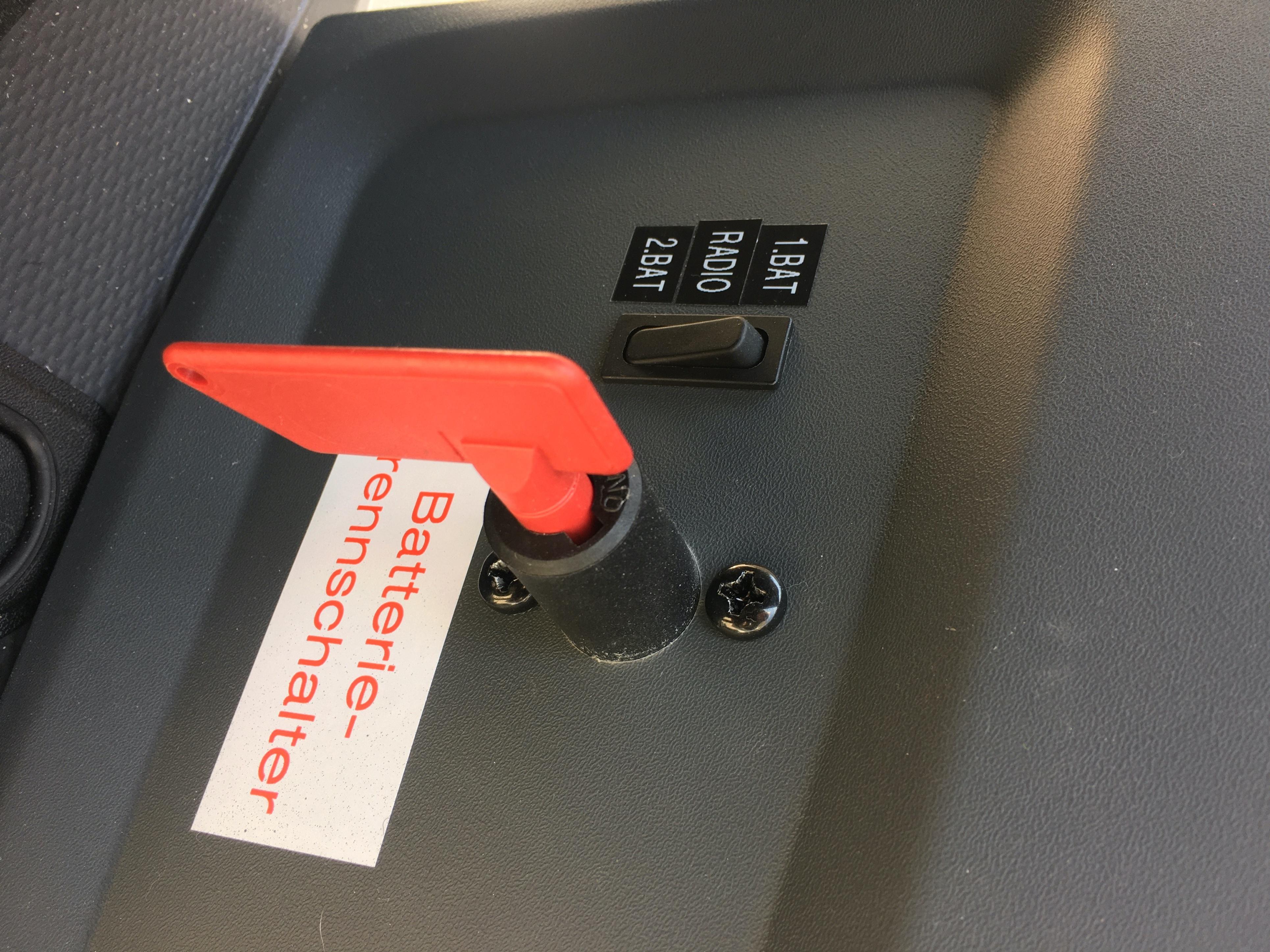Neben dem Batterie-Hauptschalter für die Aufbaubatterie habe ich einen Umschalter fürs Radio verbaut. Dort kann ich zwischen Starterbatterie und Aufbau-Batterie wählen. Das Radio läuft im Normalfall bei mir über die Aufbaubatterie, wenn ich die aber mit dem Hauptschalter trenne, vergisst das Radio seine Einstellungen, also schalte ich vor dem Trennen auf Starterbatterie um.