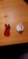 • Dann habe ich noch ein zwei Teile gefunden, deren Sinn sich mir nicht erschließt (beide etwa 3 bis 4 cm groß). Auf dem roten steht "Remove after Installation", also evt. Müll, oder ? Wo es lag, habe ich vergessen. Das weiße Teil lag in der Schublade unterm Herd.