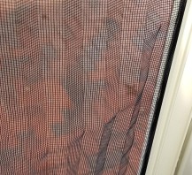 Ich versuche, soweit möglich, ohne Brille auszukommen (obwohl ich eine habe), aber es wird zusehends schlechter. Ich habe das Insektengitter schlicht und einfach nicht gesehen und bin dann voll dagegen gedonnert. Erstaunlich, dass es noch im Rahmen geblieben ist, aber es ist leider ein wenig verbogen, bzw. ausgeleiert. An der Einschlagstelle ist die schöne Ziehharmonikaform verloren gegangen, ansonsten ist aber noch alles ok.
