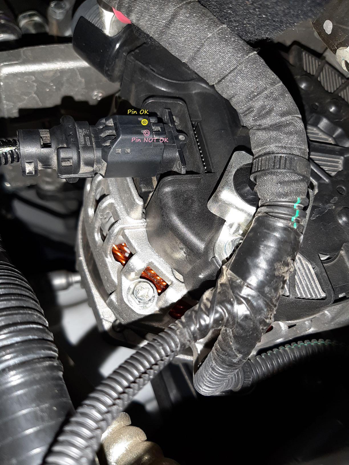 Ich habe überprüft, dass der obere Pin derjenige ist, der die Lichtmaschinenspannung steuert (das Abklemmen des unteren Pins hat nichts bewirkt). Als ich den oberen Pin abtrennte, änderte sich die Spannung von 12,2 V auf 13,7 V.