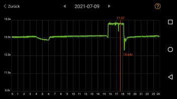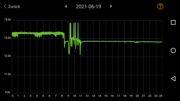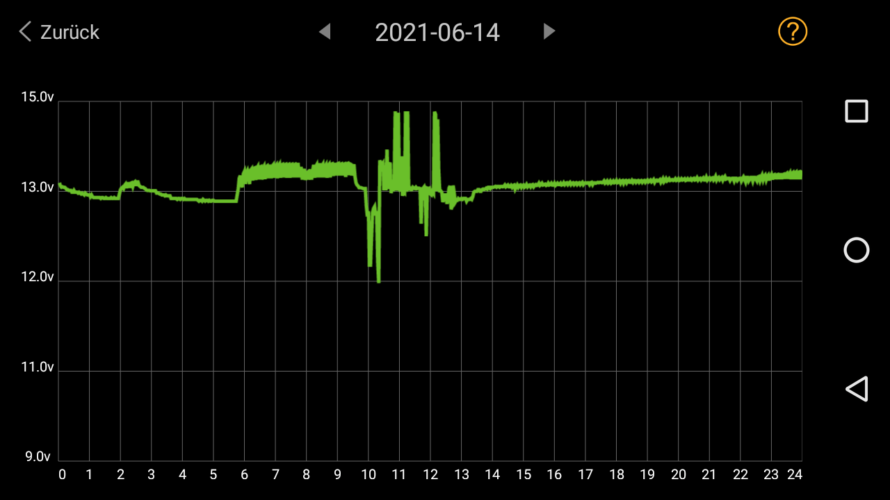 - Ankunft ca. 11:00, danach kein LandstromWie man nun sehen kann hält die Lichtmaschine die Bordspannung bei 12,8 - 13,2V.