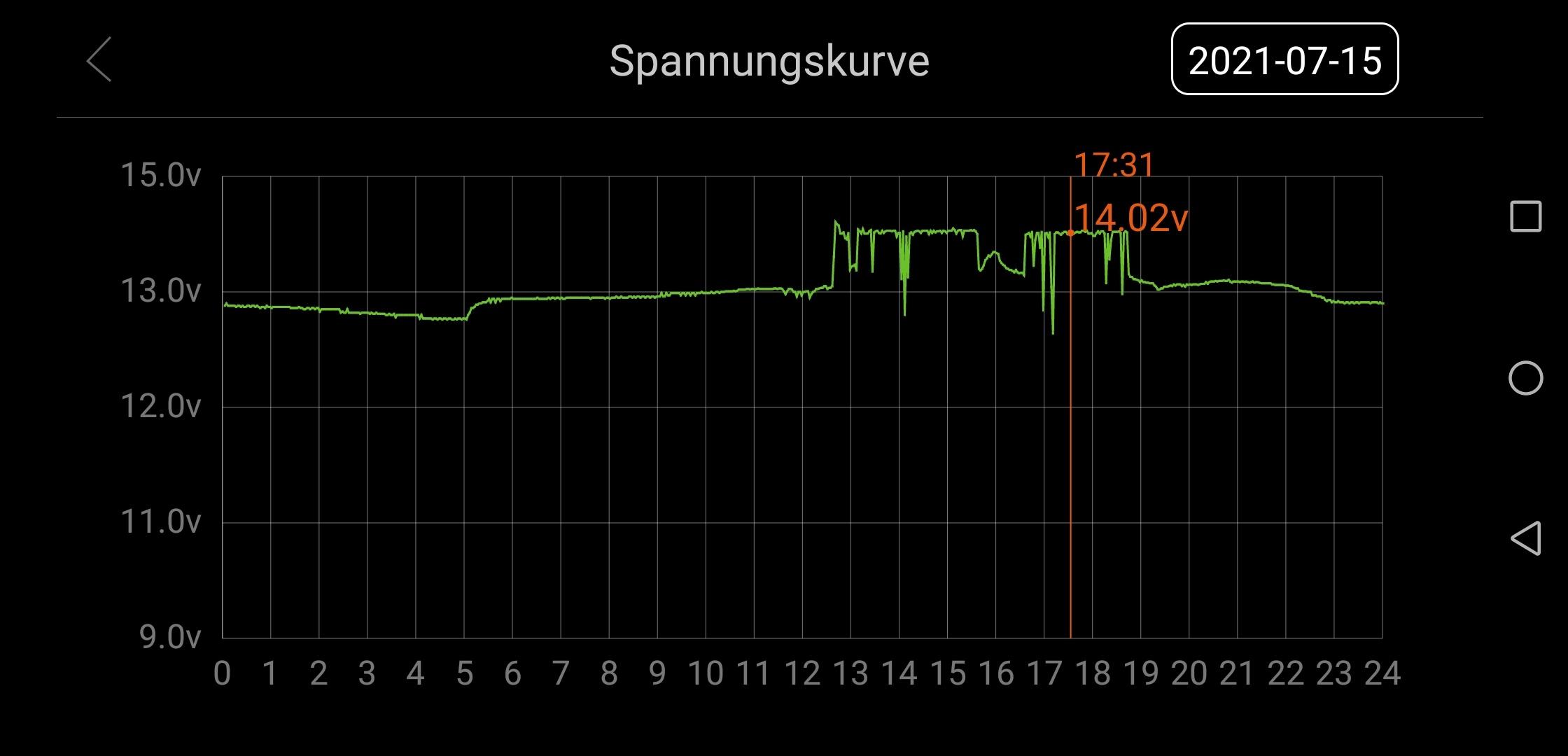 Nach Start gegen 13Uhr Spannung hoch auf 14,2V, eingependelt dann auf ca 14V