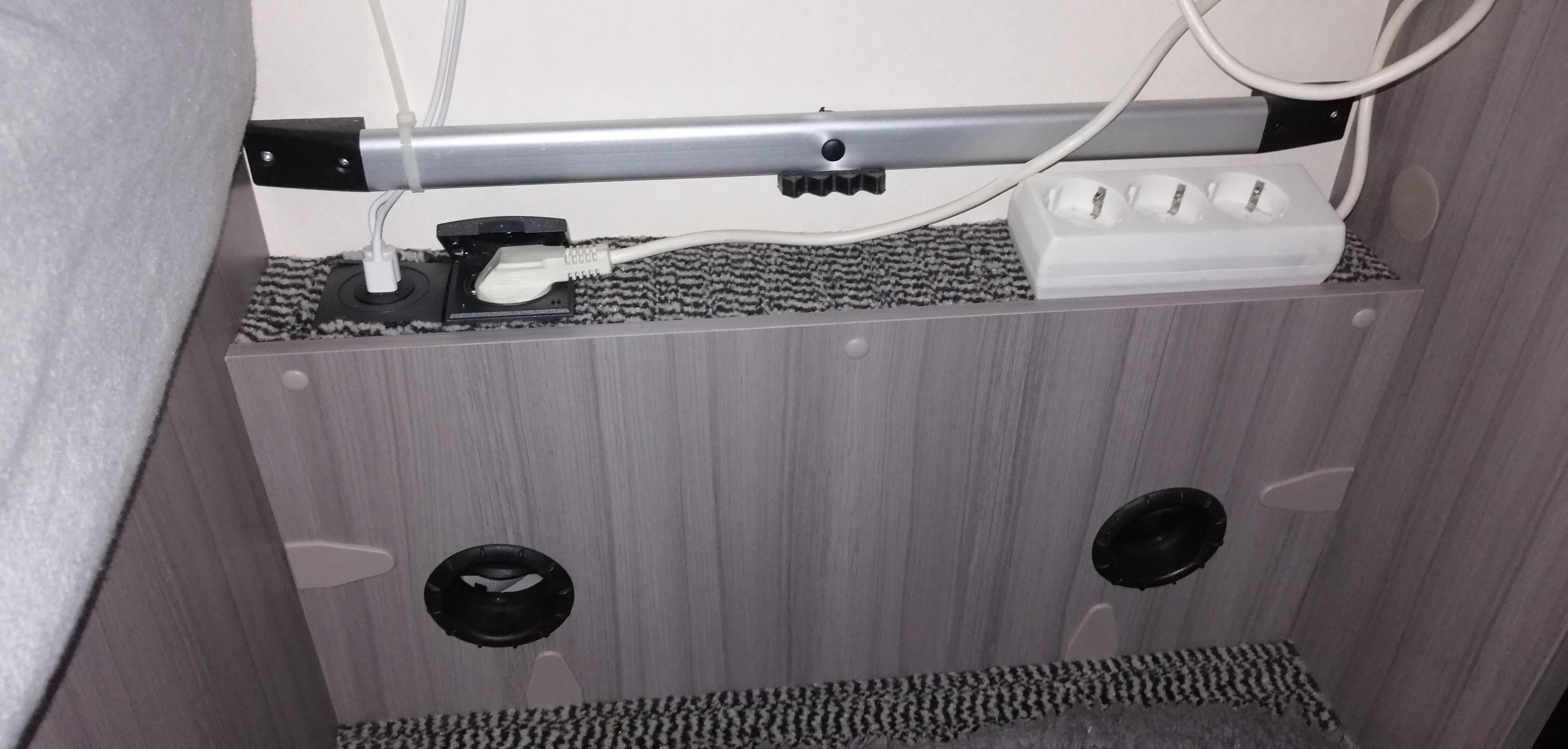 2 USB Ladekabel habe ich hinter die obere/untere Tischschiene sowieso der Stoffblende verlegt und mit einem Kabelbinder gegen RAUSZIEHEN gesichert (ist gefühlt xmal passiert) 😬.Die 3er Steckdose ist dann auch irgendwann dazu gekommen weil unser Heizlüfter ein zu kurzes Kabel hat.