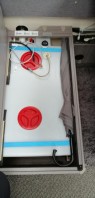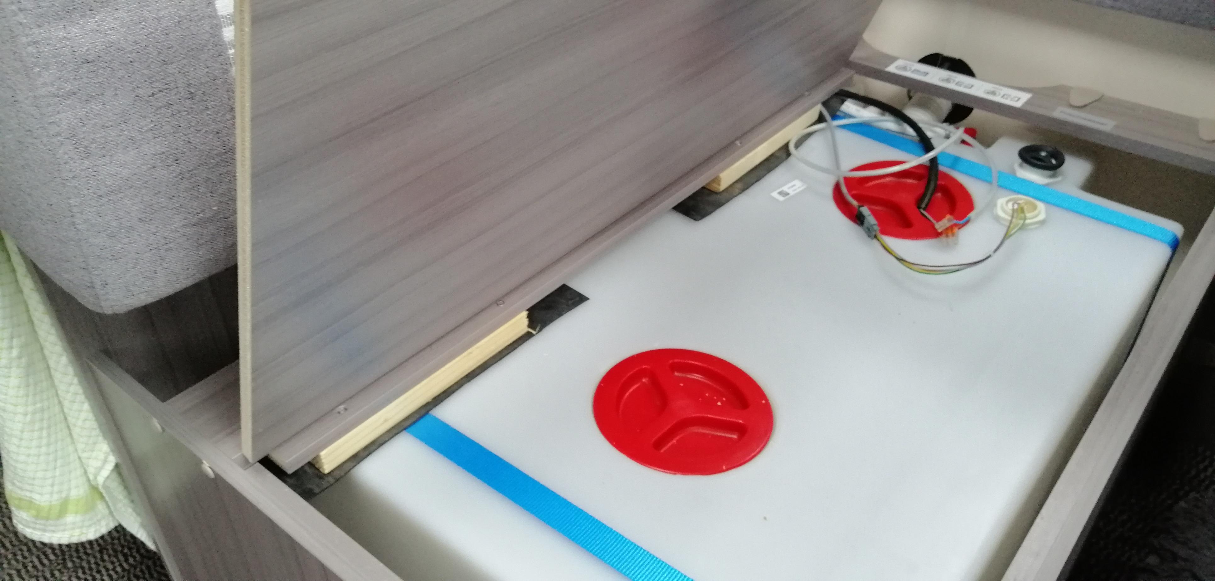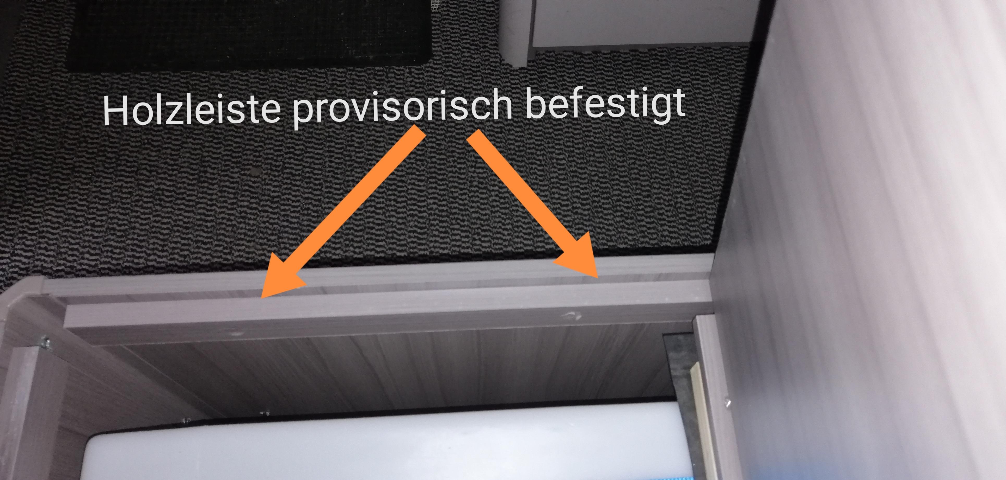 Deshalb habe bei der Schanier Seite den Abstand zwischen dem Original Holz und dem Frischwassertank mit einer Gummimatte und Holz unterfüttert.