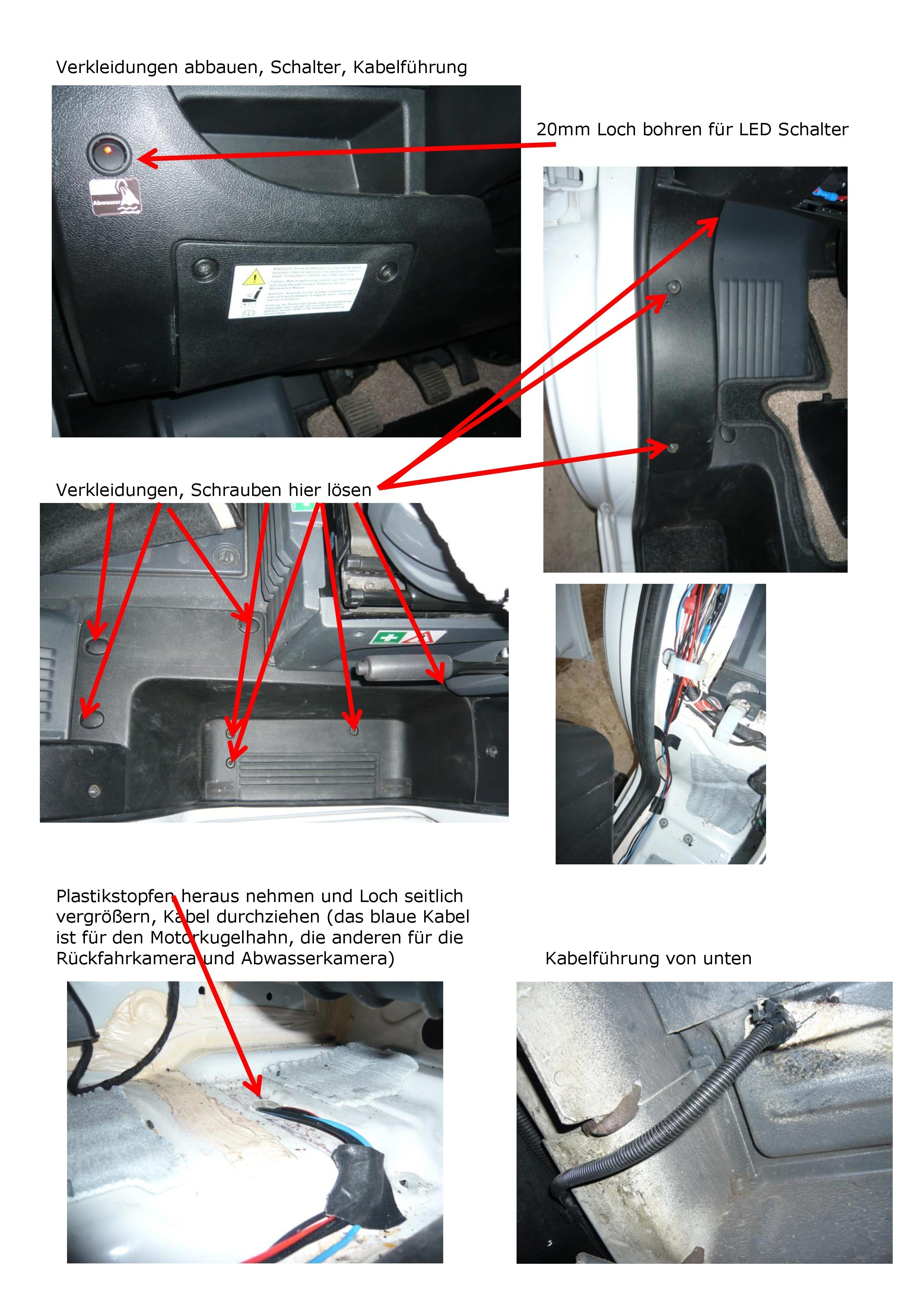 man kann das Kabel natürlich auch durch den Batteriekasten führen - das hatte ich bei Installation der Abwasserkamera in Erwägung gezogen. Wenn man den Schalter da positionieren will wo ich ich es gemacht habe, muss man auch Verkleidungen abbauen und dann unten am Batteriekasten das Kabel wieder auf die linke Seite verlegen um an den Abwasserablauf zu kommen. Das ging bei mir sehr schwierig weil ich einen 120L Dieseltank habe der unten neben dem Batteriekasten alles ausfüllt und so die Kabelführung von dort erschwert. Ich habe mich dann für den kurzen Weg entschieden und das vorhandene Loch nur seitlich etwas erweitert (2mm Bohrer). Dann kann man das Kabel mit einem Wellrohr an dem schon vorhandenen Wellrohr entlang führen und auch die vorhandenen Befestigungen nutzen.