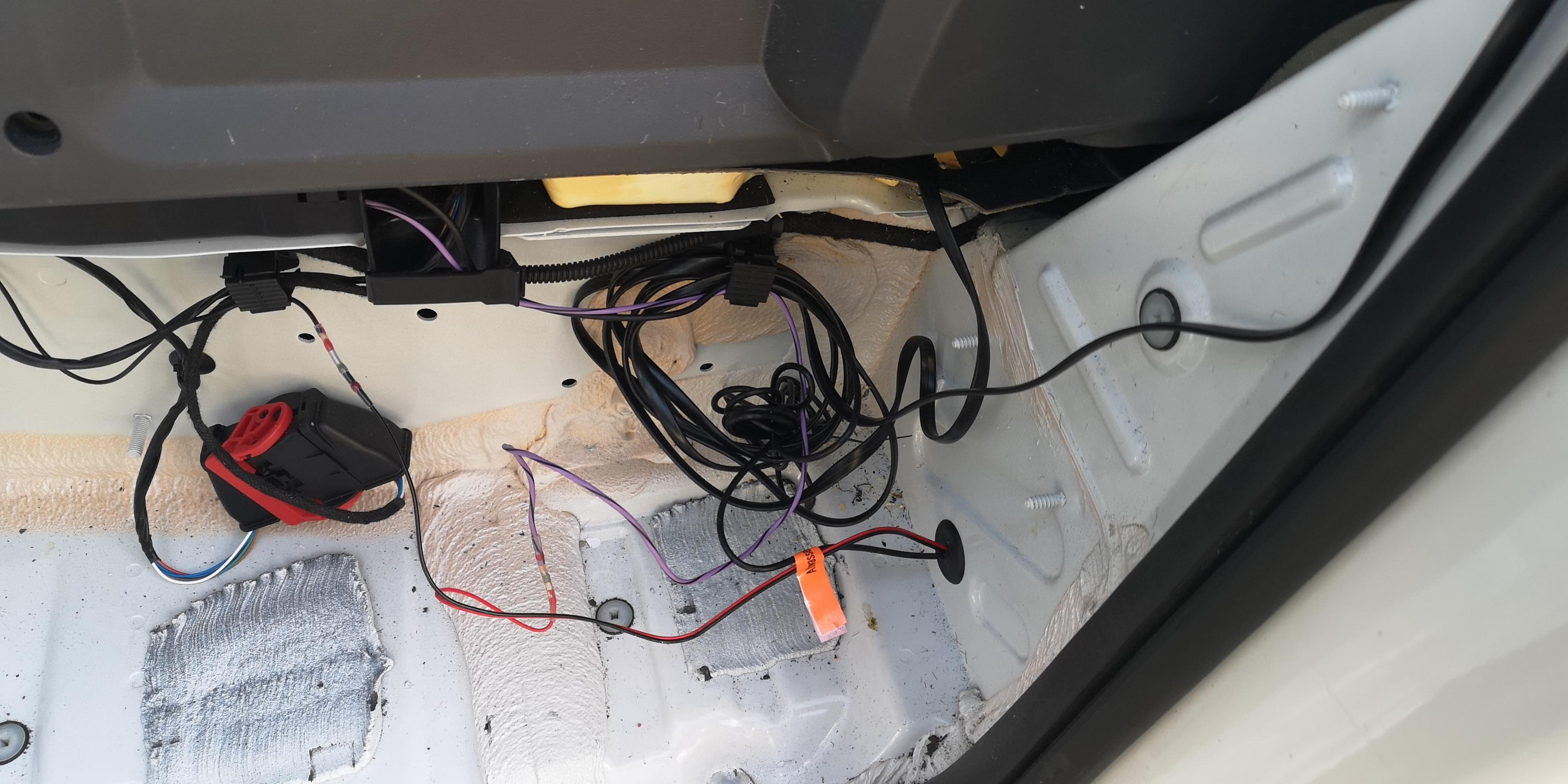 Links unterhalb des Lenkrads den Sicherungskasten mit 2 Kreuzschlitzschrauben öffnen, dann sieht man in der zweiten Reihe einen freien Steckplatz (hat Dauerplus). Hier wird der Stromdieb eingesteckt. Die Leitung des Stromdiebs muss etwas verlängert und mit einem KFZ Flachstecker versehen werden. Links vom Sicherungskasten befindet sich eine Schraube, hier habe ich das Massekabel mit einem KFZ Ringgabelschuh und einer Mutter angeschlossen.
