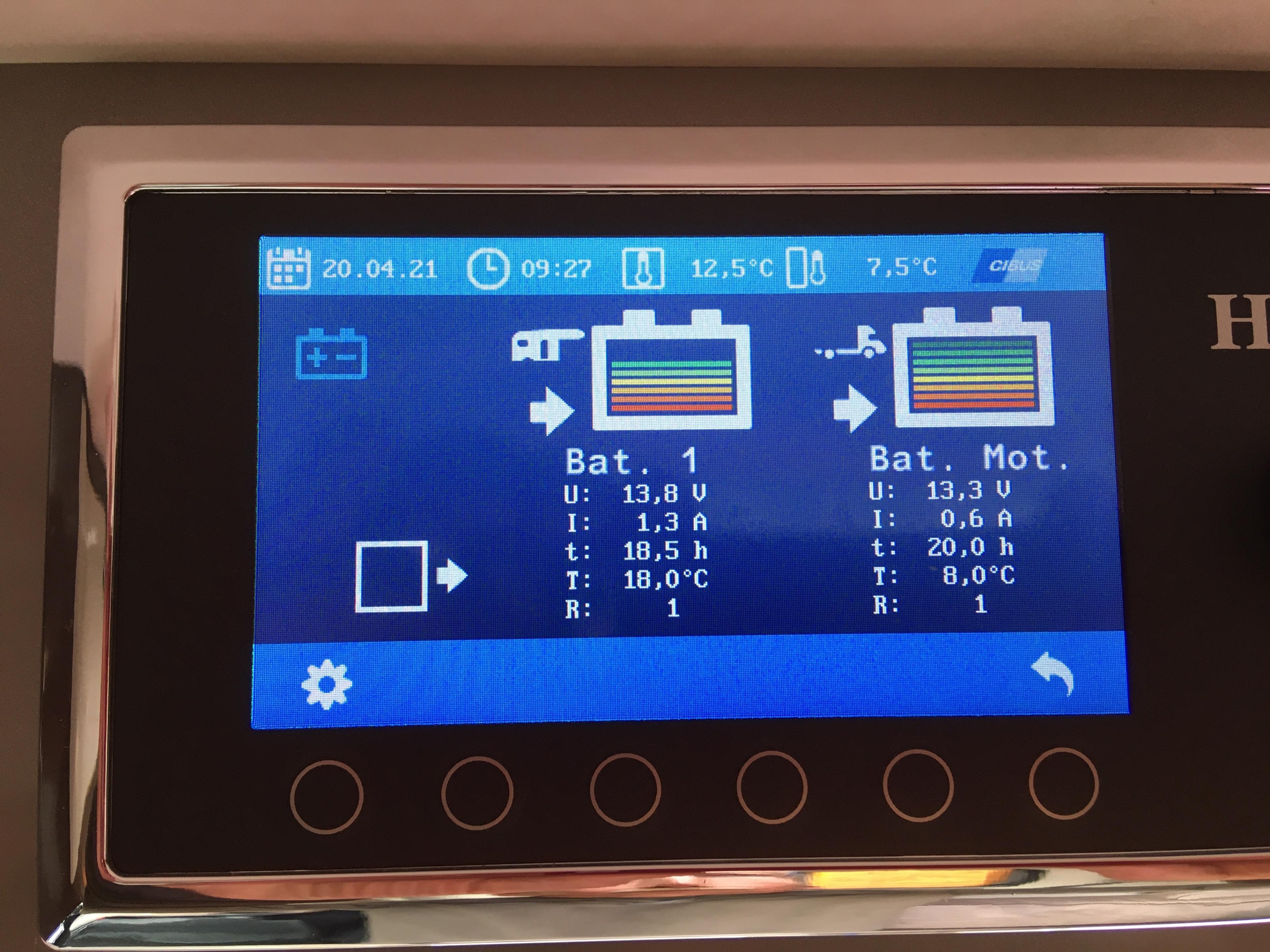 • Moin Dieter,im ersten Ansatz würde ich sagen, ja – mache Dir Gedanken. Wenn tatsächlich keine Verbraucher laufen und die die Sonne scheint sollte schon Saft auf der Batterie sein - aber leer?Die Grad-Zahlen können schon unterschiedlich sein. Die eine unterm Sitz, die andere im Fussraum – 7 Grad Differenz scheint mir noch ok. Sieht aber so aus als ob die Solar-Zellen nicht laden. Soweit es Dir möglich ist, solltest du mal den Laderegler prüfen, ggf. Sicherungen checken. Wird am TFT (hast du TFT Display?) den angezeigt das die Zellen Strom einspeisen? Ein Pfeil sollte in die Batterie zeigen, natürlich nur dann wenn das Ladegerät vom 220 Volt Netz getrennt ist.Gruß IBI