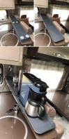 Dafür haben wir uns extra die Senseo Switch ausgesucht, die da perfekt drauf passt. Auf unserem letzten Tripp ist sie kaputt gegangen. Eingeschaltet, laufen lassen – fertig. Aber die Kanne war leer – der Wassertank auch! Die Maschine hatte im Innenleben einen Riss - das Wasser ist dann schön an der Rückwand und am Sitzbankpolster runtergelaufen. Zum Glück klares Wasser!