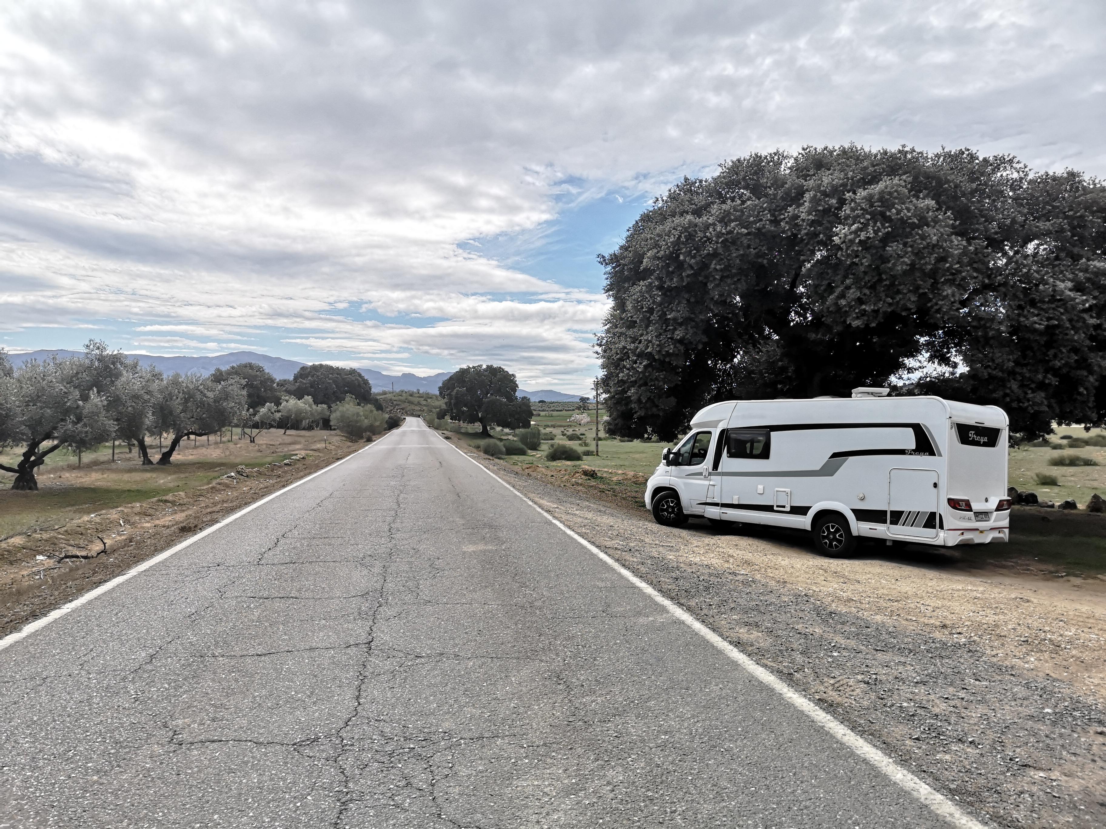 ZitatFreya unter Steineiche an total leerer Landstrasse, 🇪🇸
