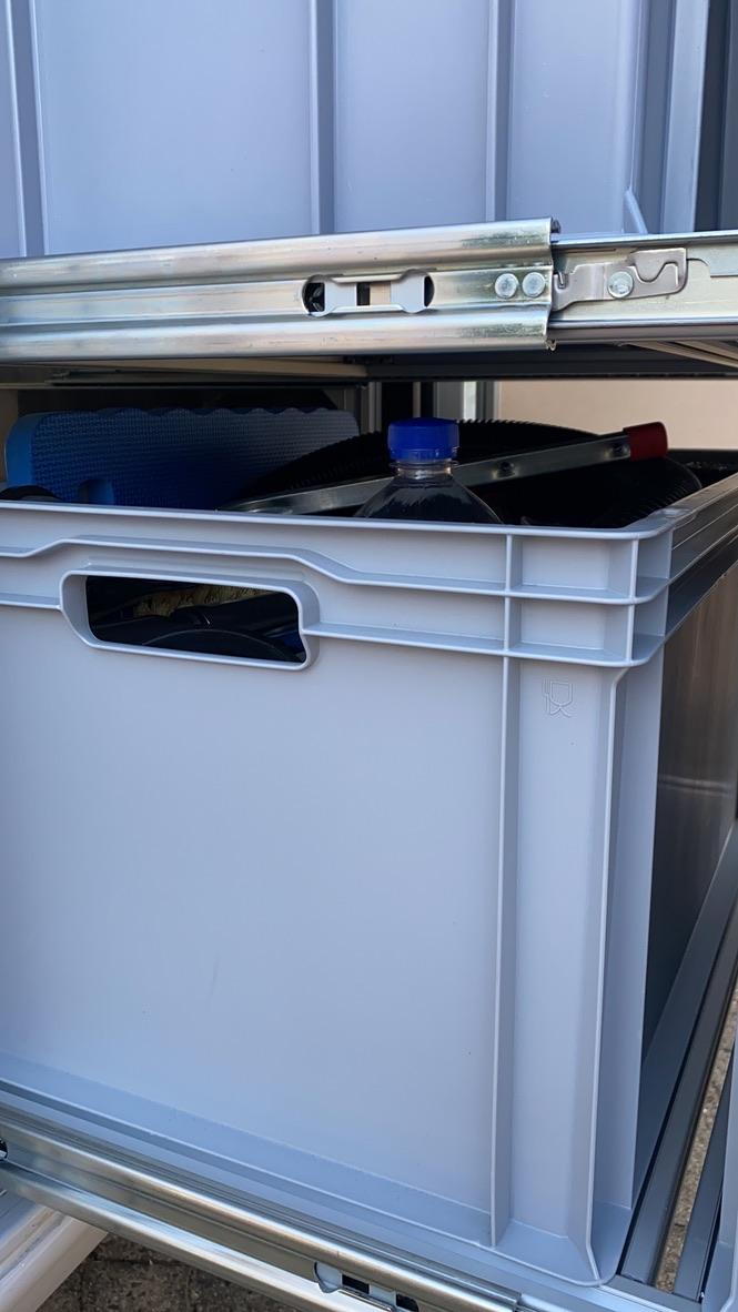 Sieht ja, schick aus, aber was tust du denn alles in die vielen, grossen Euro-Boxen rein?? Ich hab bei mir 2 grosse Flache + 2 halbe Euro-Boxen in der Garage und hab alles, dabei was ich brauche. Daher ist auch noch genug Platz f 2 Fahrräder (28" Rennräder oder 29er MTB) und Tisch Stuhl.....