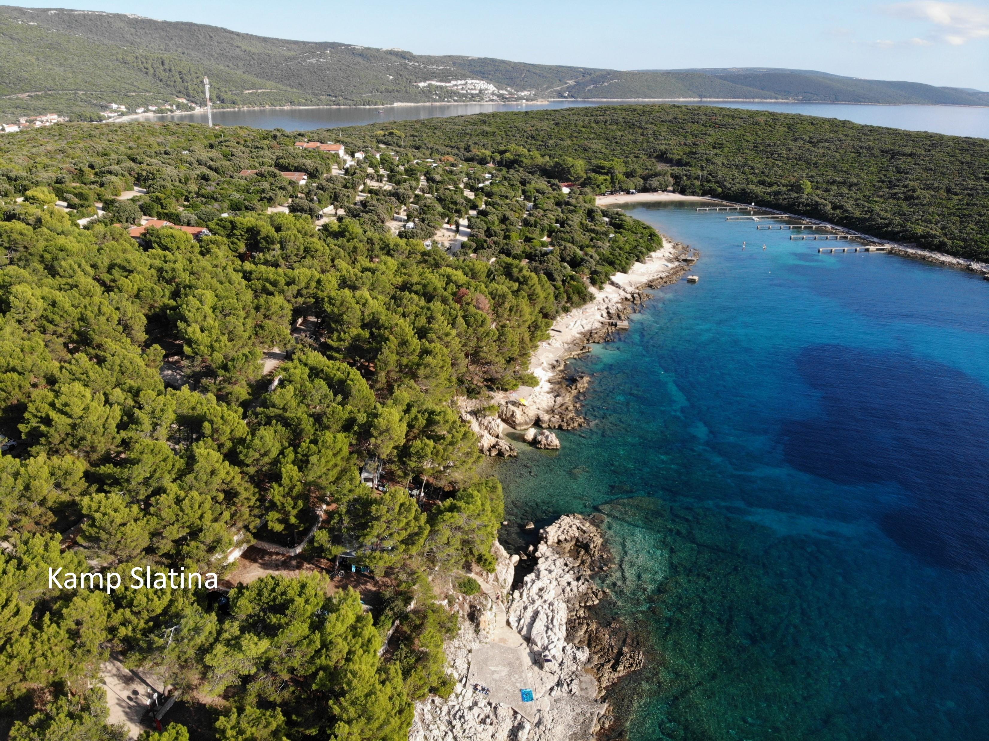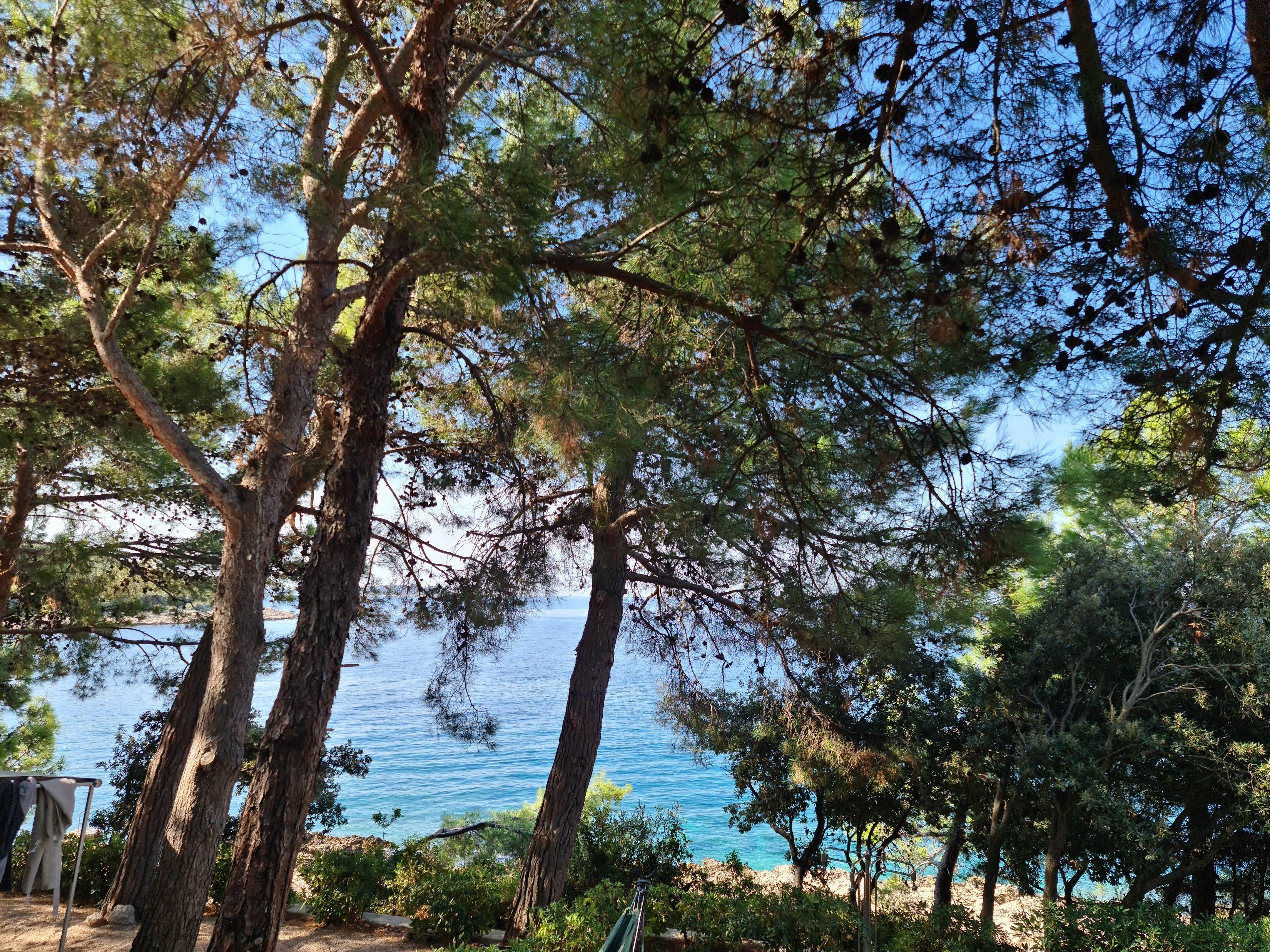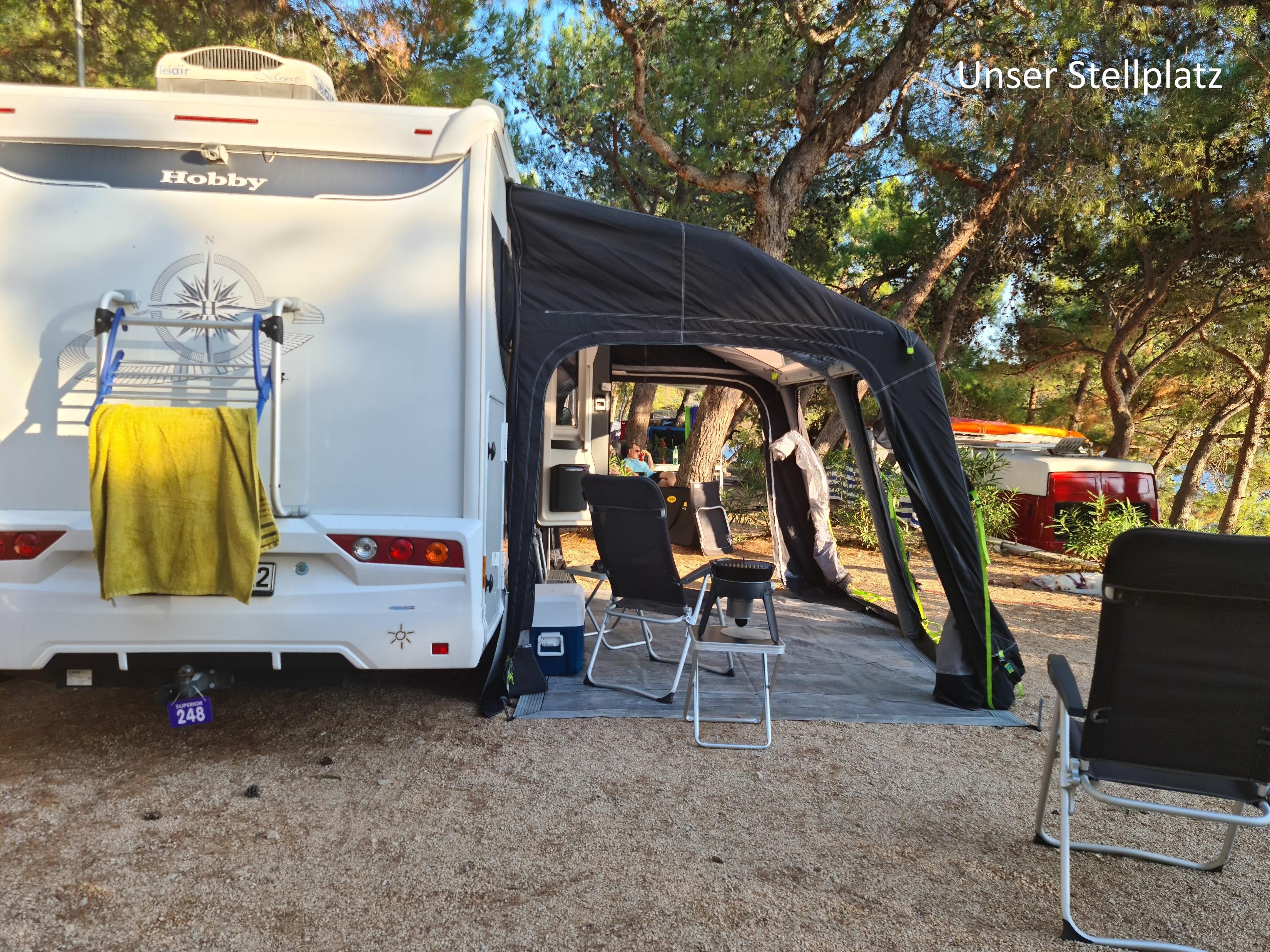 Auf der Insel hatten wir, bereits im März, einen Stellplatz in der zweiten Reihe (die erste Reihe, direkt am Wasser, war damals schon ausgebucht) auf dem Kamp Slatina für drei Wochen reserviert. Der Platz liegt terrassenförmig in einer geschützten Bucht und mitten in einem Pinienwald. Die Stellplätze sind alle topfeben und recht groß. Alle Infos über diesen Campingplatz findet man im Internet, unsere persönliche Beurteilung ist: traumhaft. Wir sind ja erst seit zwei Jahren als Camper unterwegs, aber einen solchen Platz haben wir noch nie erlebt. Alles ist TOP-gepflegt, es gibt moderne und sehr gut ausgestatte Sanitärhäuser, die mehrmals täglich gereinigt werden (die putzen bevor der Dreck entsteht). Überall guter und freundlicher Service. Auf dem Platz ist ein gut sortierter Supermarkt, ein schönes Restaurant, eine sehr guten Pizzeria und ein Café/Bar. Dreimal pro Woche kann man auch an einem Stand neben dem Supermarkt, frischen Fisch direkt vom Fischer kaufen