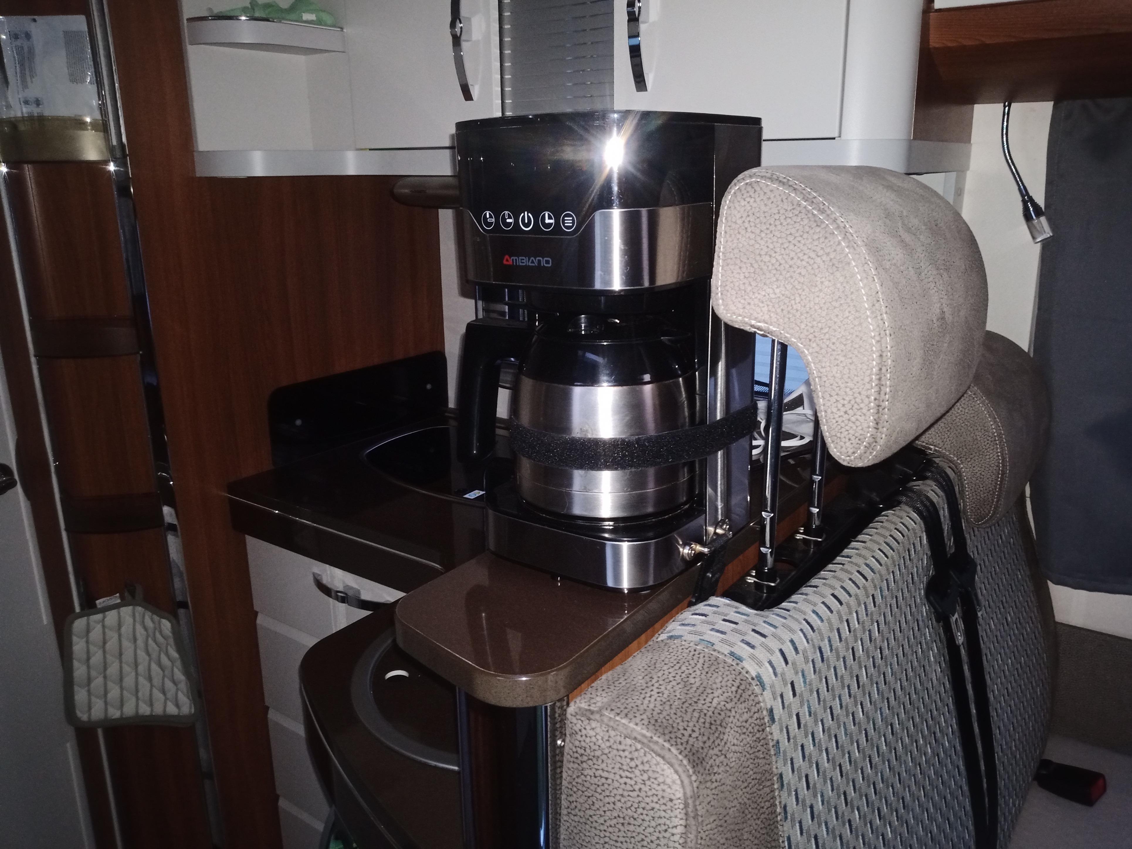 ich hab etwas zum Kaffee (als Oberkaffeeonkel ) und unserer Outdoorküche beizutragen: wir haben eine handelsübliche Kaffeemaschine für Filterkaffee im Betrieb. Bei der Anschaffung war mir besonders wichtig, dass (bei fehlendem Landstrom) mit einem Wasserkessel (der natürlich auch für Tee etc. brauchbar ist) über den geöffneten Deckel heißes Wasser vom Herd eingefüllt werden kann: so hat meine Oma auch ihren Kaffee gebrüht. Die Maschine ist mit 2 Klettbändern und passenden Ösen auf der Ablage zwischen Küche und Dinette befestigt, Während der Fahrt wird die (Isolier-)Kanne mit einem weiteren Klettband gesichert: