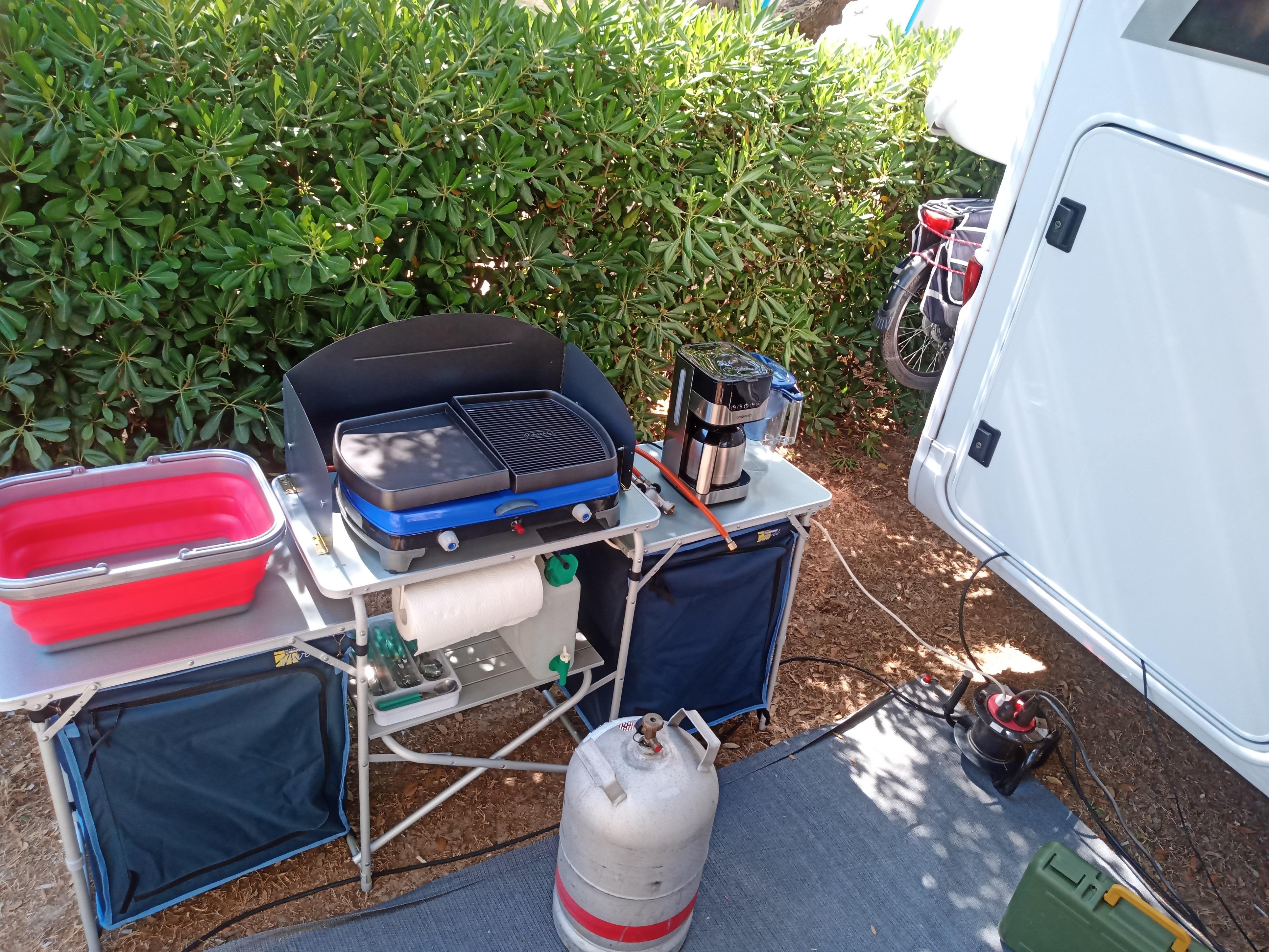Je nach Witterung kann die Kanne leicht zum Freisitz vor dem Wagen mitgenommen werden; oder aber (bei längeren Aufenthalten) in der Outdoorküche aufgestellt werden (hier in der Aufbauphase zu sehen):