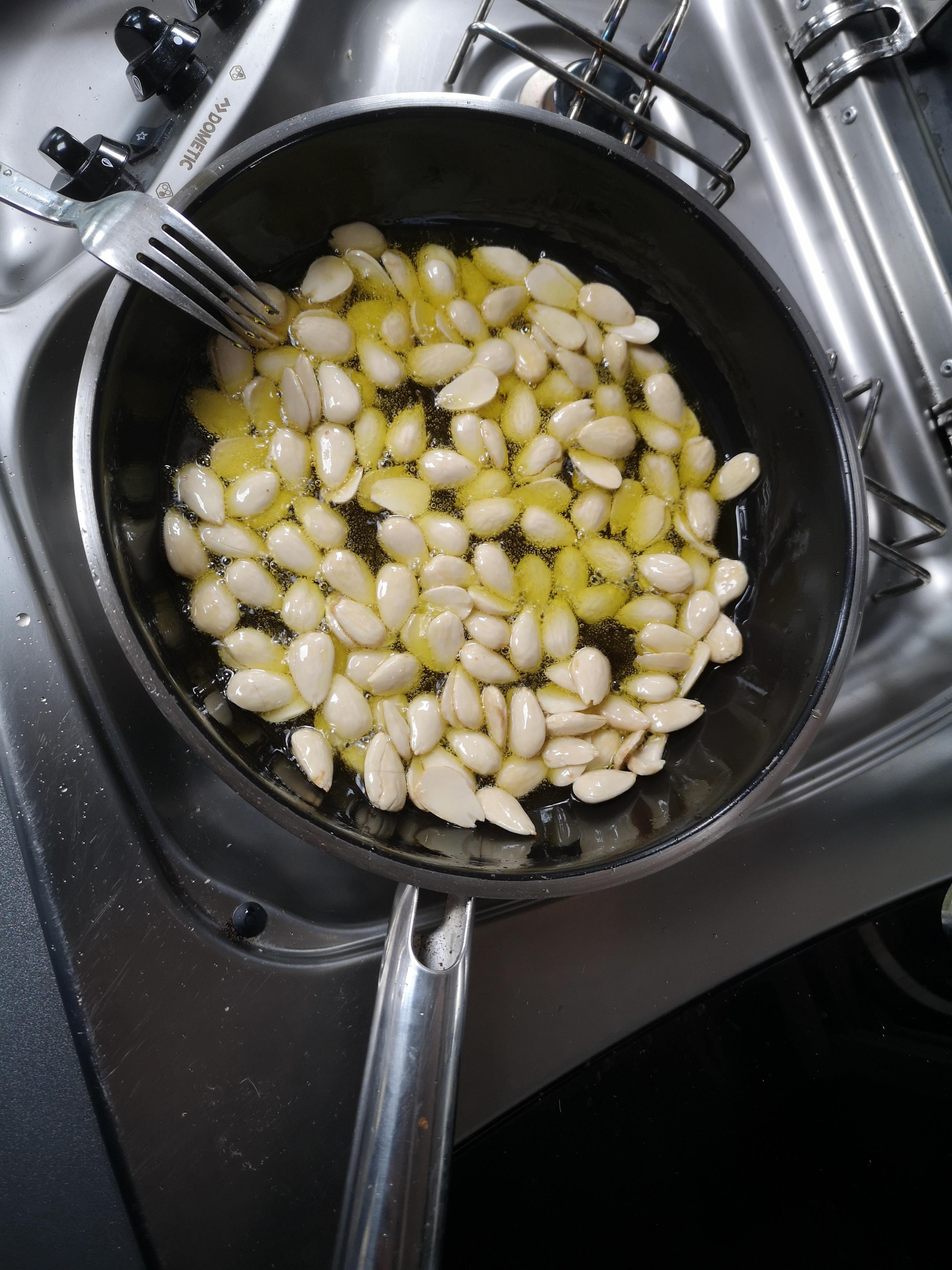 -Öl in Pfanne erhitzen, wenn es heiss ist, Mandeln rein und rösten, bis leicht braun