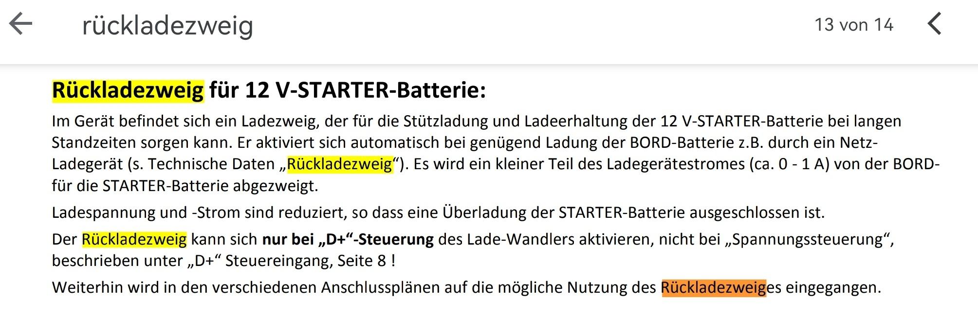 Zitat : "Die Ladung der STARTER-Batterie bei Netzbetrieb wird vom EBL übernommen. Der Rückladezweig des Lade-Wandlers ist hier nicht aktiv."