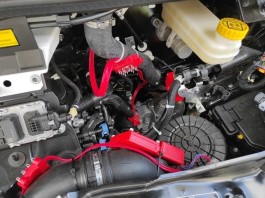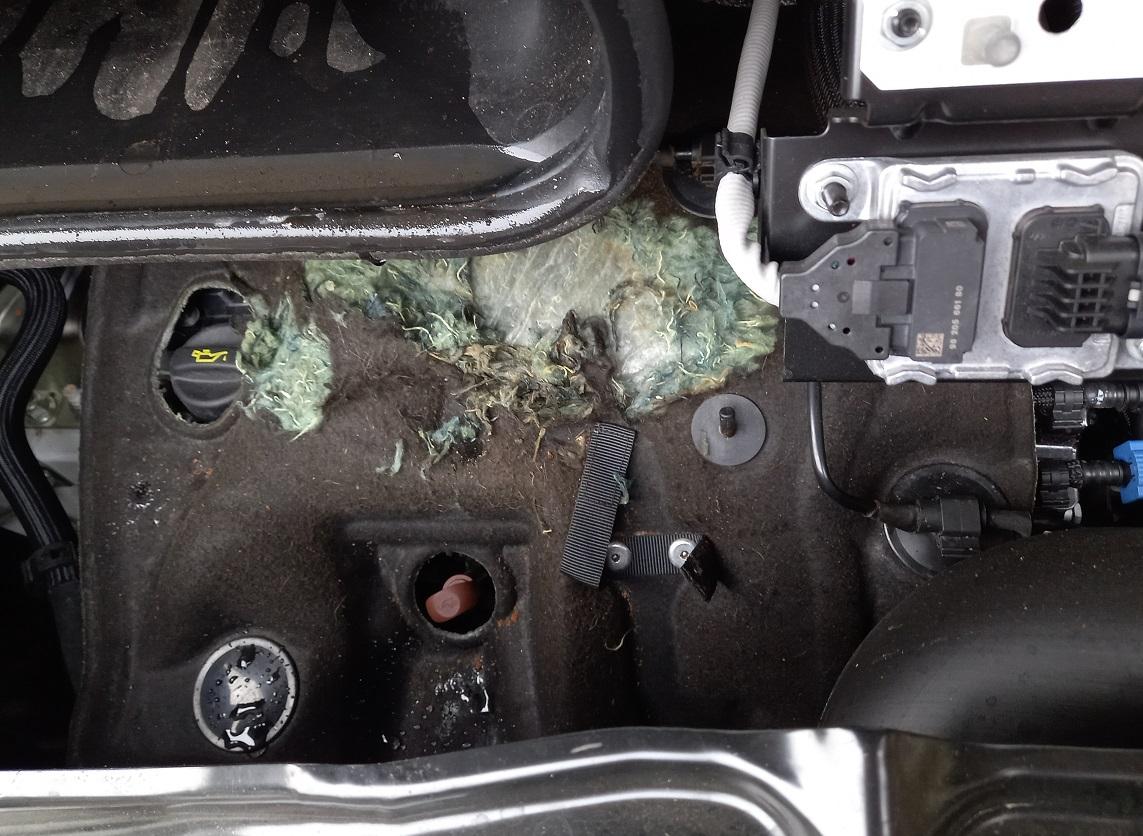 Jedenfalls haben wir Dämmwoll-Reste unterm Motorraum gefunden. Ein Blick ins Innere zeigt die 'Modifikation' an der Abdeckung über dem Block :