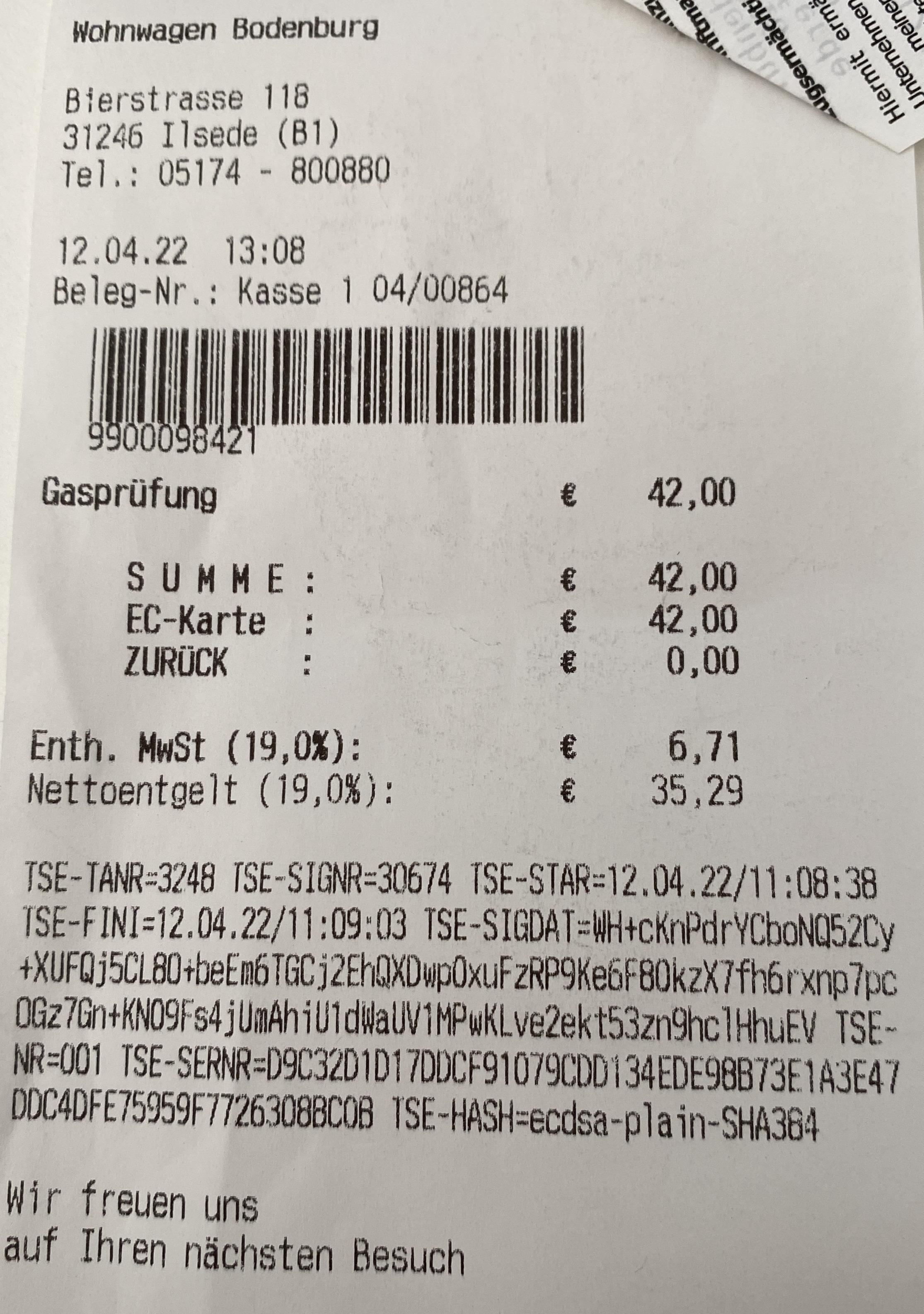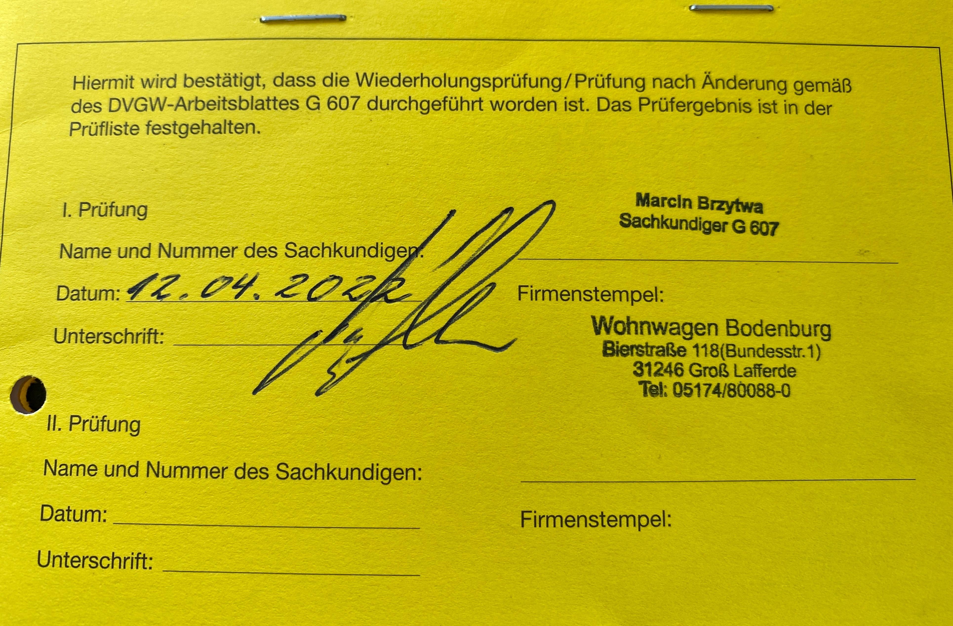 Durch den Neukauf eines gebrauchten Wohnmobiles bei einem Händler im März diesen Jahres wurde die HU und die Gasprüfung erneuert.