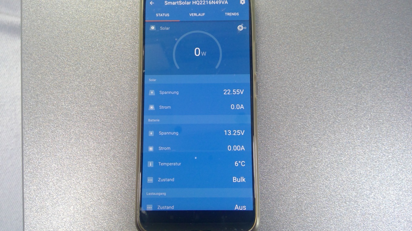 Ja, Peter, was den Standardwert für Float angeht hast du recht, ist in der App 13,5V. Da jedoch in der Bedienungsanleitung 13,2V steht hatte ich den zunächst runtergesetzt. Jetzt sind wieder die Standardwerte eingestellt. Ausserdem habe ich mal die Temperaturbegrenzung für die Batterie von Standard 5°C auf 2°C runtergesetzt. Nun wird der Zustand mit "Bulk" angegeben und die blaue LED blinkt, was wohl heisst, dass das System mit Strom versorgt wird, jedoch nicht ausreichend Strom vorhanden ist um den Ladevorgang zu starten. Derzeit ist bedeckter Himmel, muss wohl abwarten, bis die Sonne durchkommt.