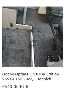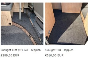 Ich sehe gerade, dass es große Unterschiede beim Teppich-Preis zwischen "Kastenwagen" und "Teilintegrierte" gibt. Soviel größer ist unser kompakter V65GE doch gar nicht. Als Beispiel mal die Gegenüberstellung bei den Modellen von Weinsberg. Einen günstigen Vantana-Teppich hat Feelgoodcamper.de nicht im Sortiment.